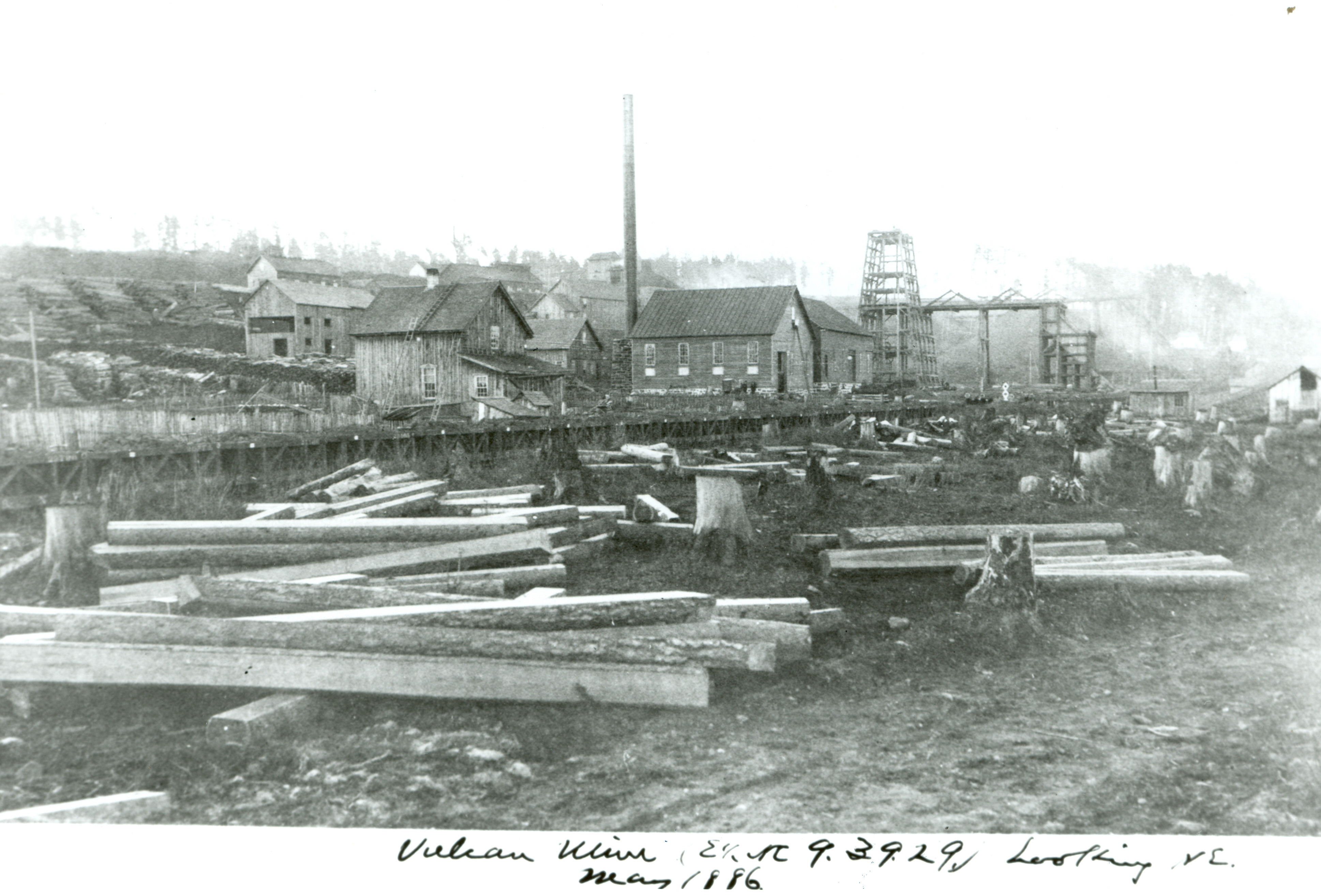 Photograph looking northeast, of the Vulcan Mine, located on the E1/2 of the NE1/4 of Section 9, T39N, R29W. Notice the huge timbers with rough sides in the foreground and the large number of logs piles in the upper left of the photograph. 'Vulcan Mine E1/2 [---] 9.39.29. Looking NE. May 1886' is printed on the photograph.