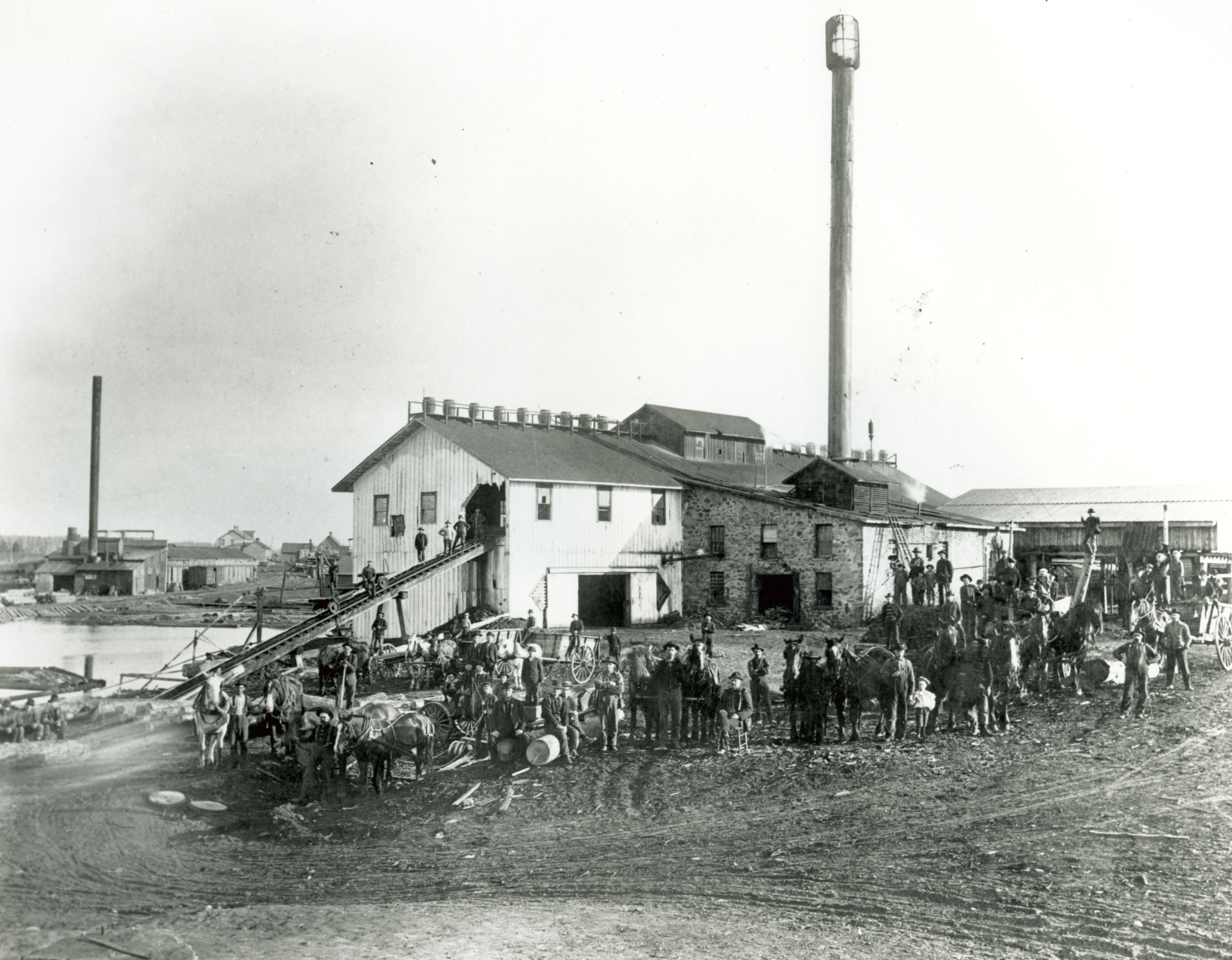 Photograph of the Sagola Lumber Company's first sawmill. Note water barrels on the sawmill rooftop in case of fire, and the wire cage on the smokestack to help contain sparks.