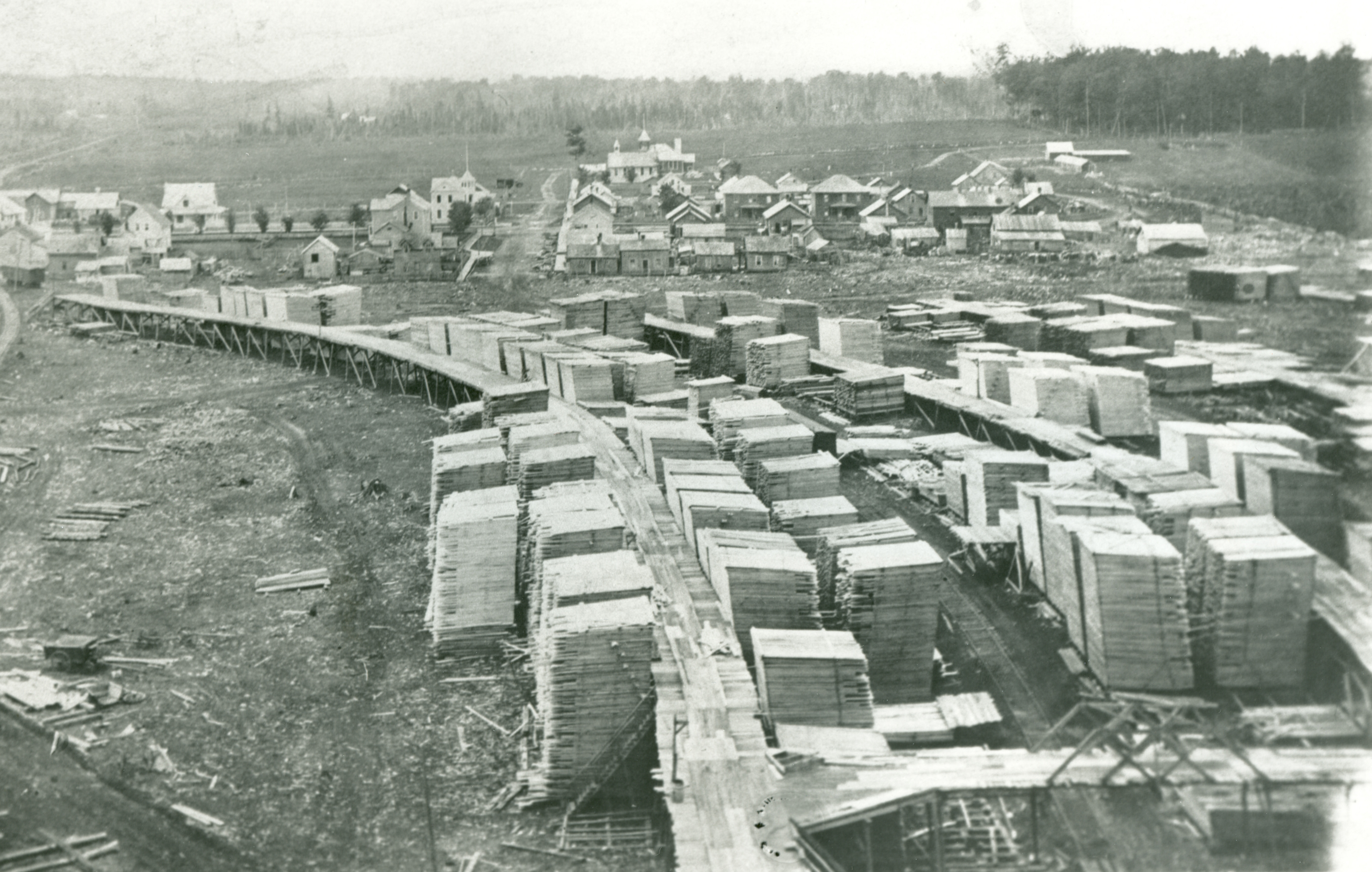 Photograph of the village of Sagola, looking south from the lumberyard. In the distance the town hall is visible, the Catholic church and the schoolhouse.