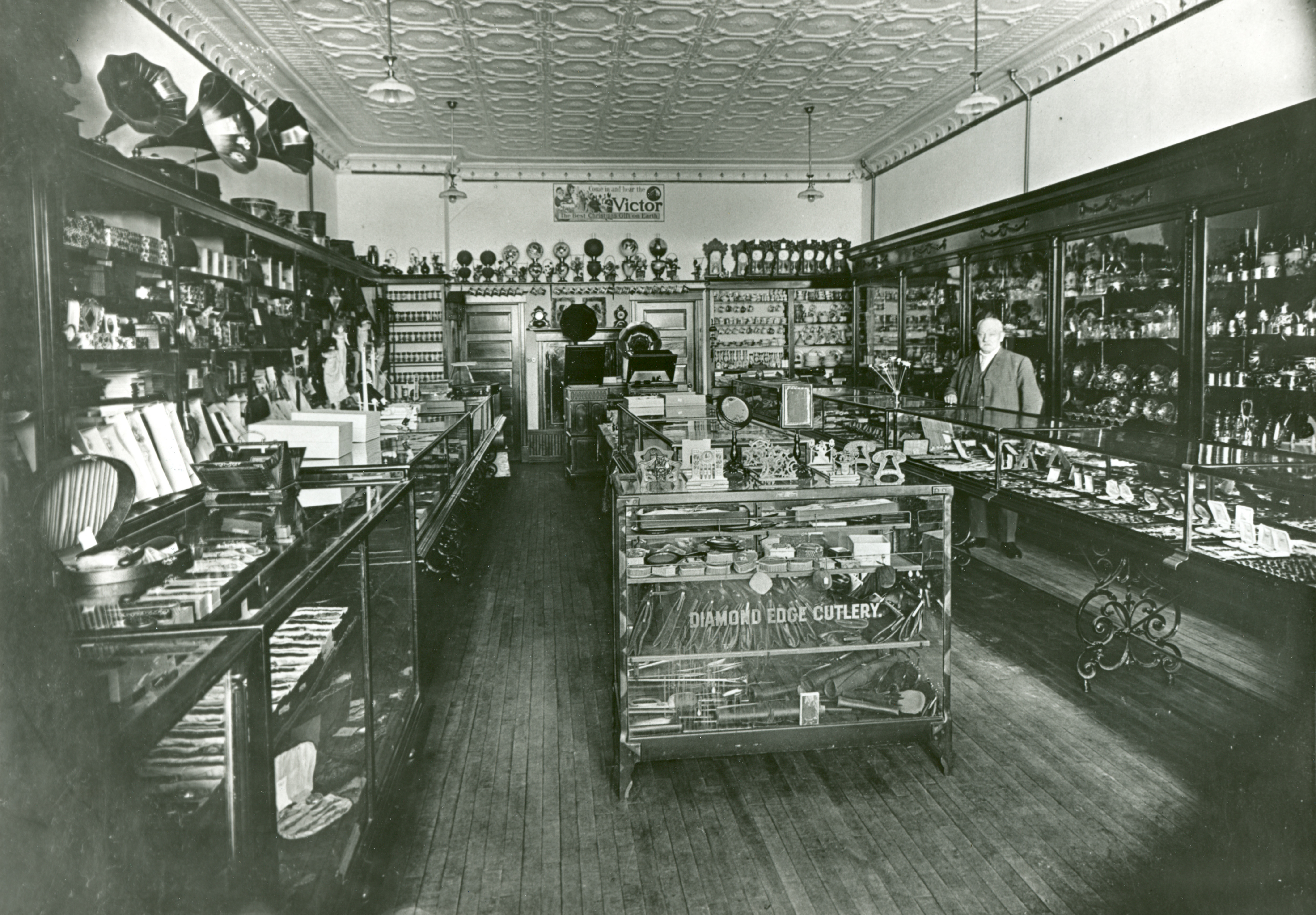 Photograph of the John E. Eklund jewelry store located at 318 Main Street in Norway. Note the Victor phonographs with morning-glory horns on the top shelf at the back of the store
