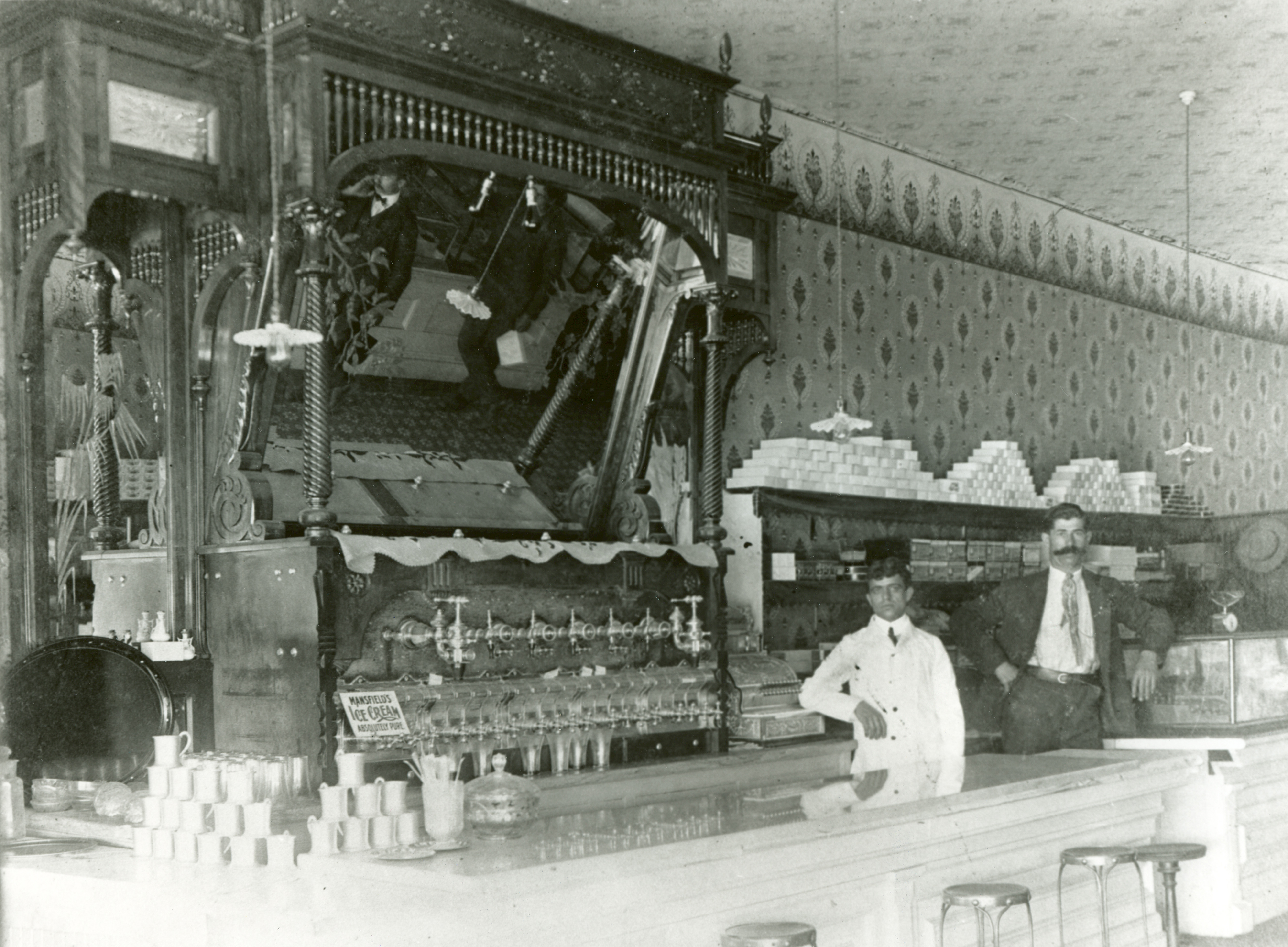 Photograph of Sam (left) and Abe Khoury behind the soda fountain either at Sam's East Ludington Street Store or one of the earlier shops on Stephenson Avenue. Note the elaborate soda fountain with numerous spigots and glassware. Two male customers are reflected in the mirror above the soda fountain.