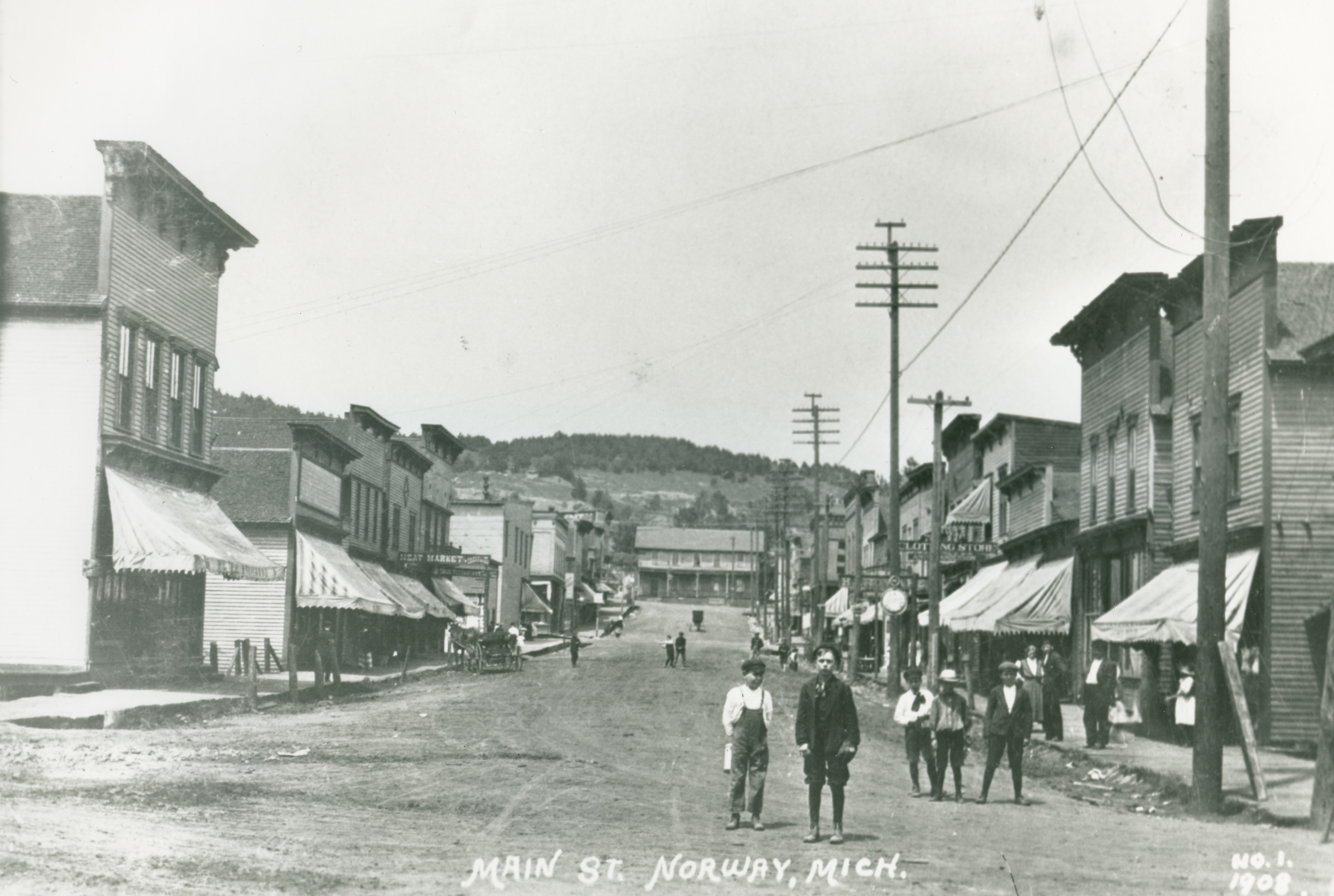 Photograph taken in 1908, of Main Street (now Hillcrest Drive) looking north. 'Main St. Norway, Mich.; No. 1. 1908' is printed on the photograph.