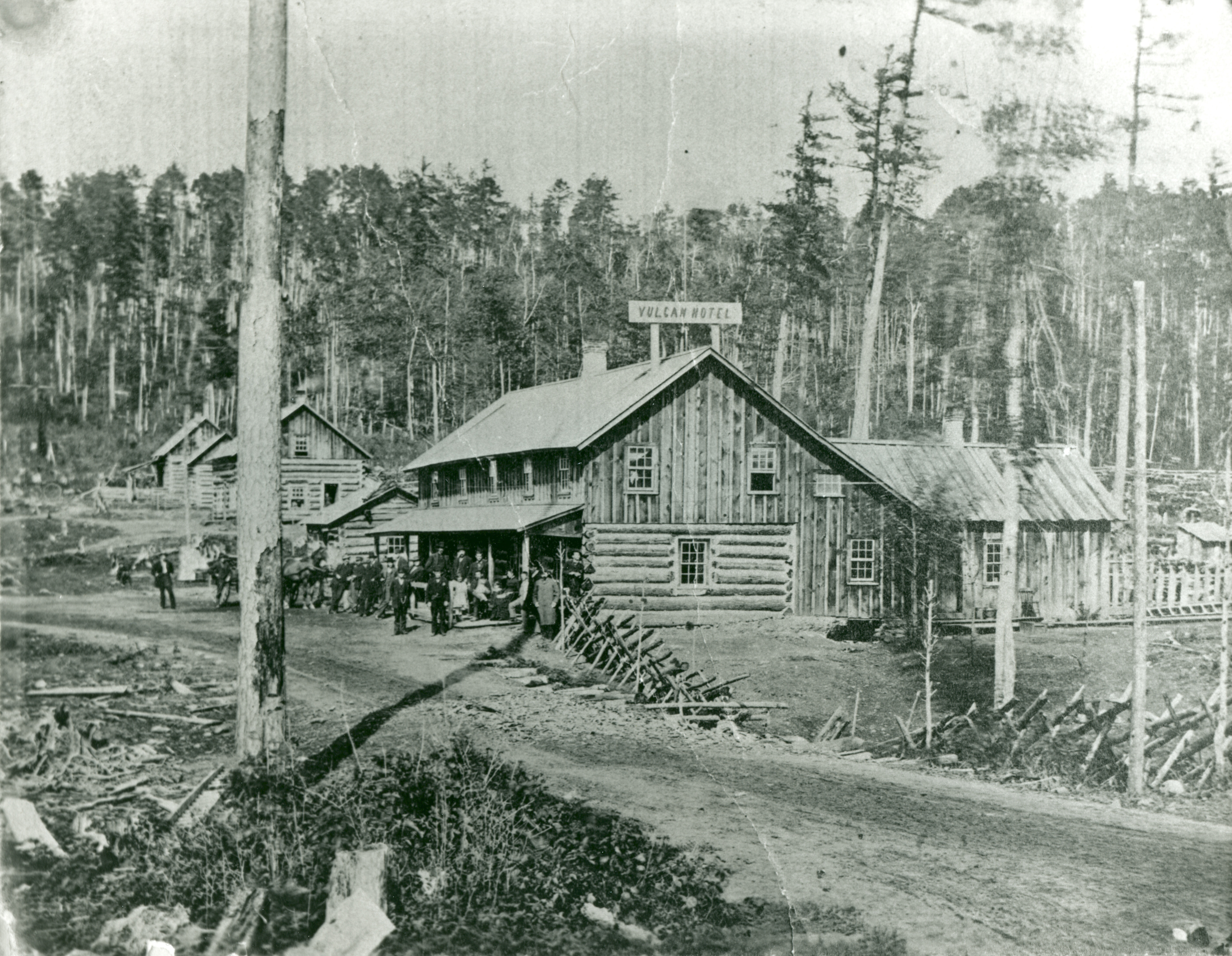 Photograph of the Vulcan Hotel - the first hotel on the Menominee Range, opened in 1878. The hotel was located on the west side of Mission Street and some early log residences, typical of early settlements, are visible to the north of the hotel. In addition to serving as a hotel, the structure later served as a store and was Vulcan's post office until the new town hall was erected in 1904. The hotel was razed in 1905.