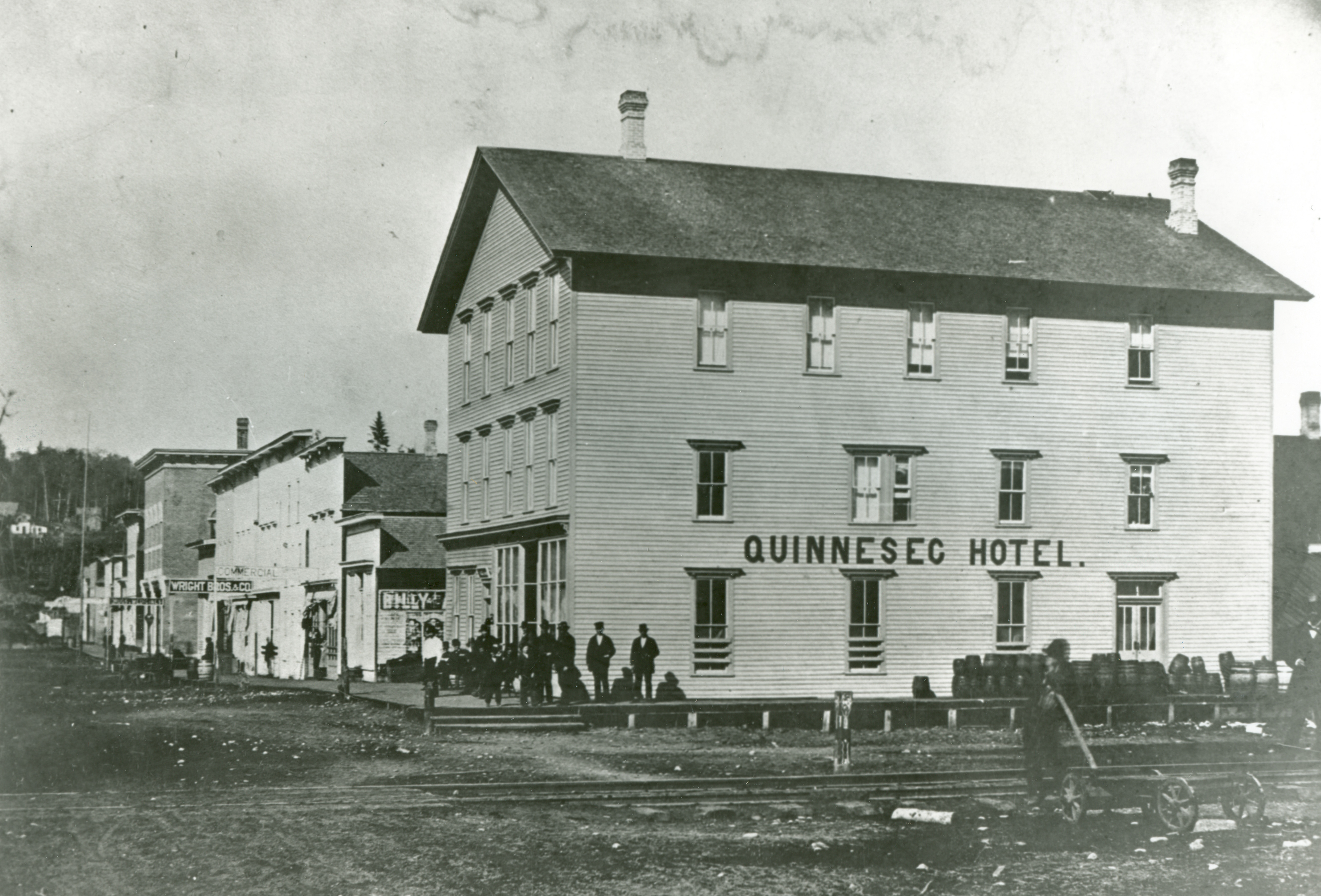 Photograph of the east side of Quinnesec Avenue looking north in the village of Quinnesec. This is the area between Pine Street on the south and Brule Street and beyond on the north. The Chicago & North-Western Railway tracks are in the foreground. The Quinnesec Hotel was managed by A. Clement. A bit farther up the street is the Commercial Dining Hall, run by W.W. Felch. Wright Brothers general store, run by Jason K. and Anson W. Wright, is just up the block. The two-story brick building on the north side of Paint Street is Buell's Opera house.
