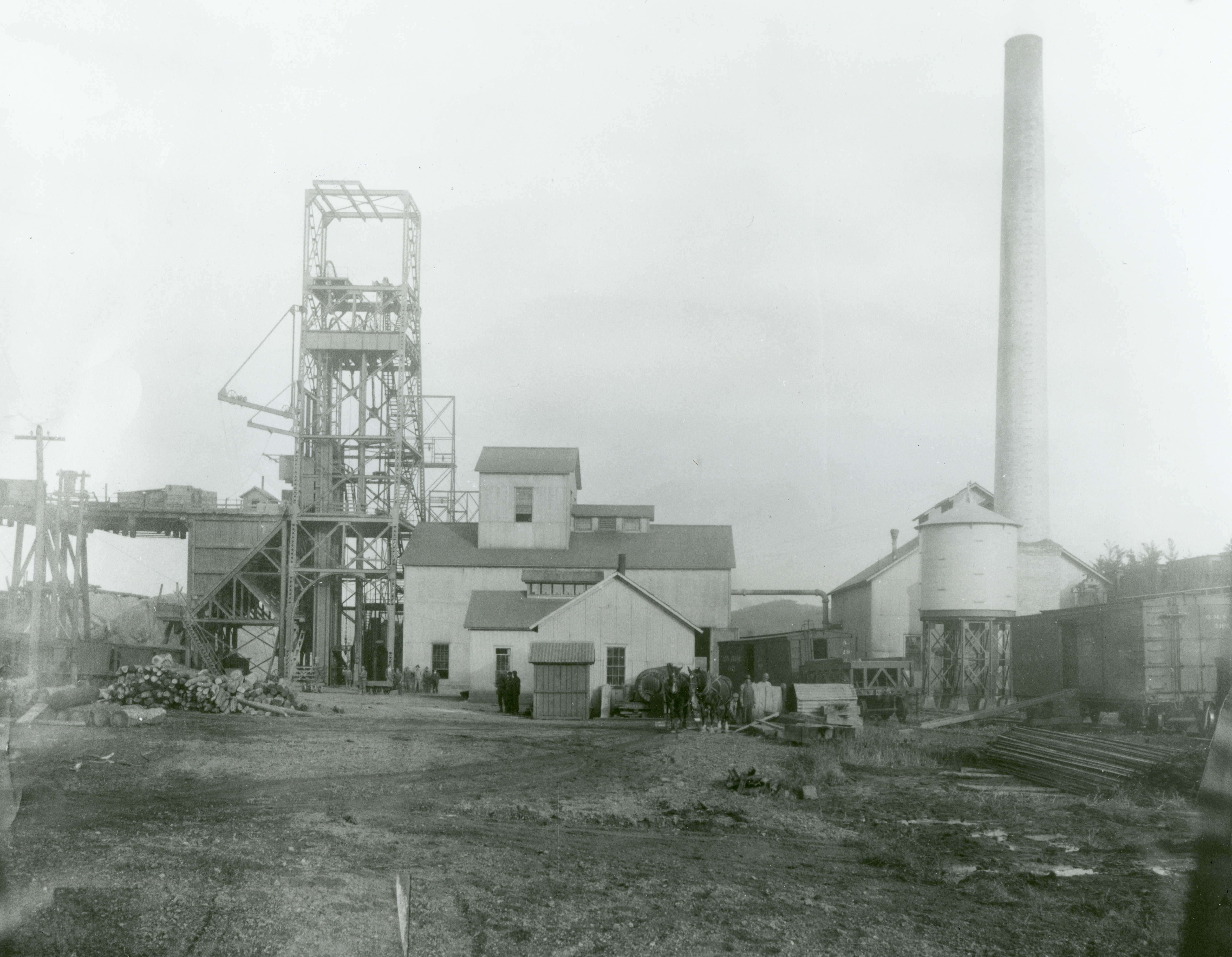 Photograph of the C. Ludington Shaft, facing east, shows the shaft housing which rose 114 feet above the collar of Iron Mountain's Chapin Mine. The chutes to the left allowed ore cars, like those pictured, to be loaded directly, as the ore came up in the tram cars on the hoist.
