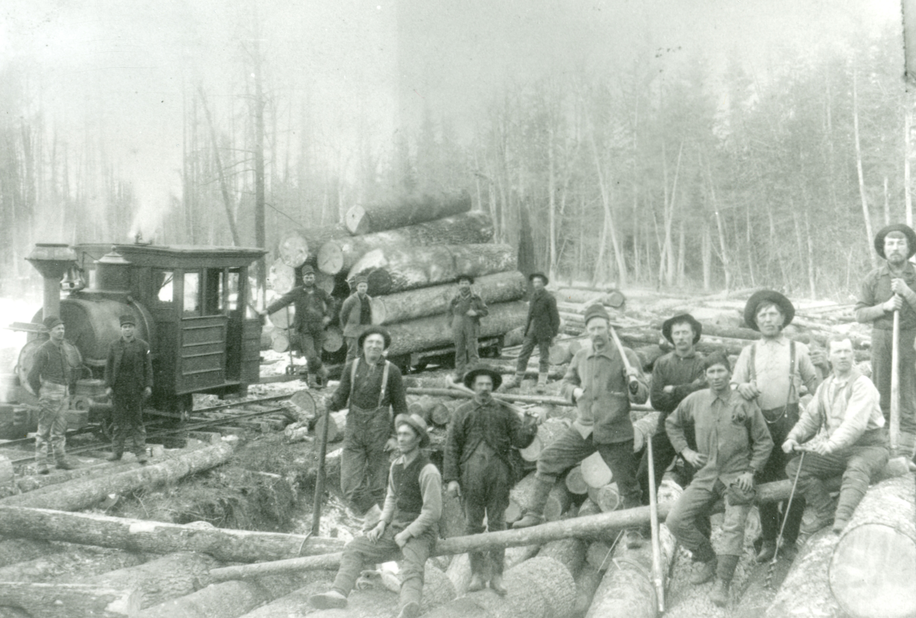 Photograph of a William A. Homes & Son logging crew taken somewhere east of the Michigamme River. William A. Holmes is standing fourth from the left in front of the narrow gauge railway car filled with logs. Tom King, a Chippewa Indian who lived in and around Dickinson County for many years, is holding his hat against his leg. The lumberjack behind King with his foot resting on the log and a cant hook over his left shoulder is Patrick 'Paddy' Costigan.