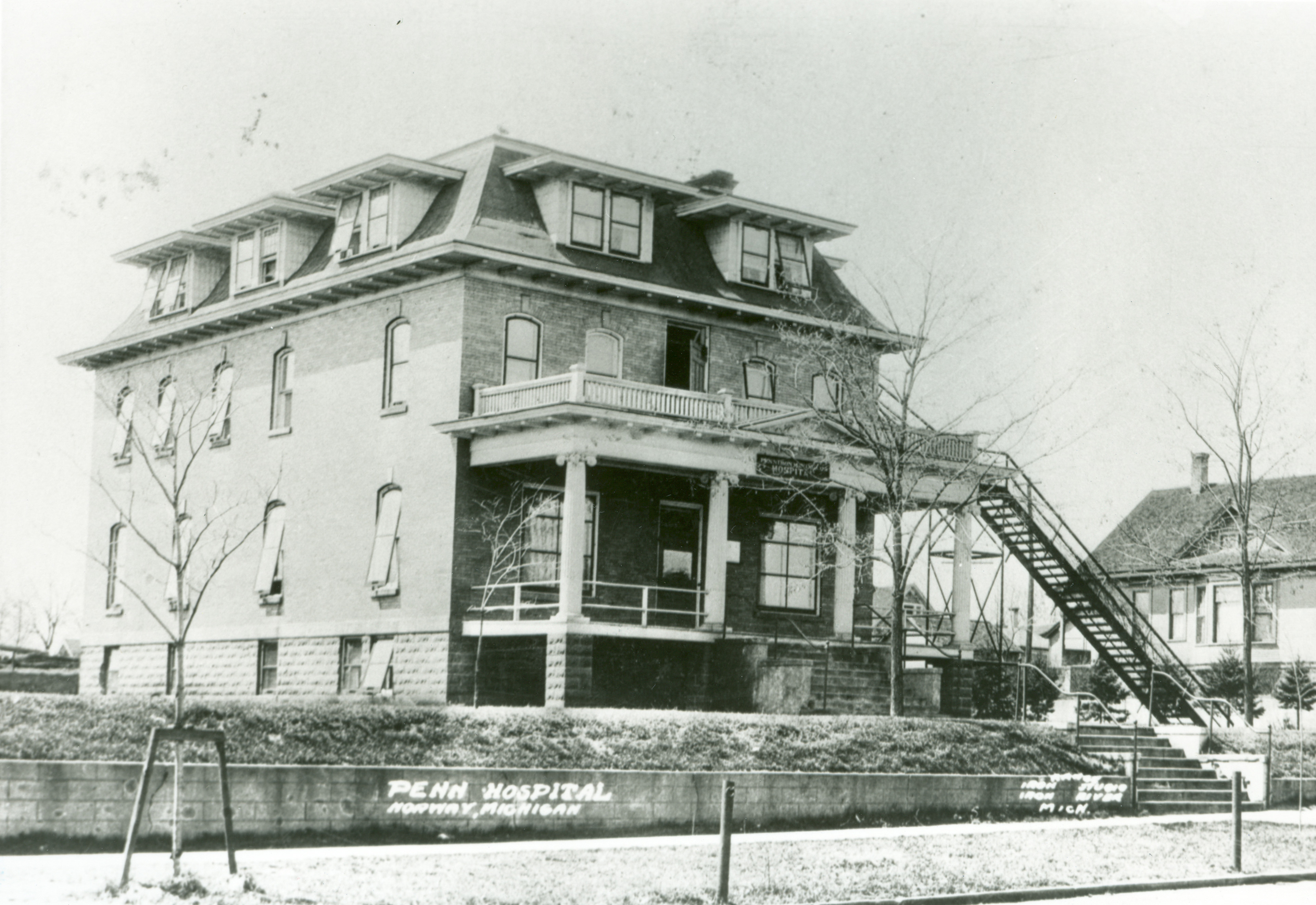 Photograph of the former Husson House, a three-story hotel that was received as part of a settlement with the United States Steel Corporation, after the Columbia Hospital was damaged due to the ground sinking. In 1909 the Husson House was moved to 620 Norway Street, placed on a new foundation and veneered with brick and became the new Columbia Hospital. In 1913 the hospital was sold to the Penn Iron Mining Company and run as the Penn Hospital until 1946 when it was sold to the City of Norway where it operated until 1960 when the Anderson Memorial Hospital was opened. 'Penn Hospital Norway, Michigan' is printed on the photograph.