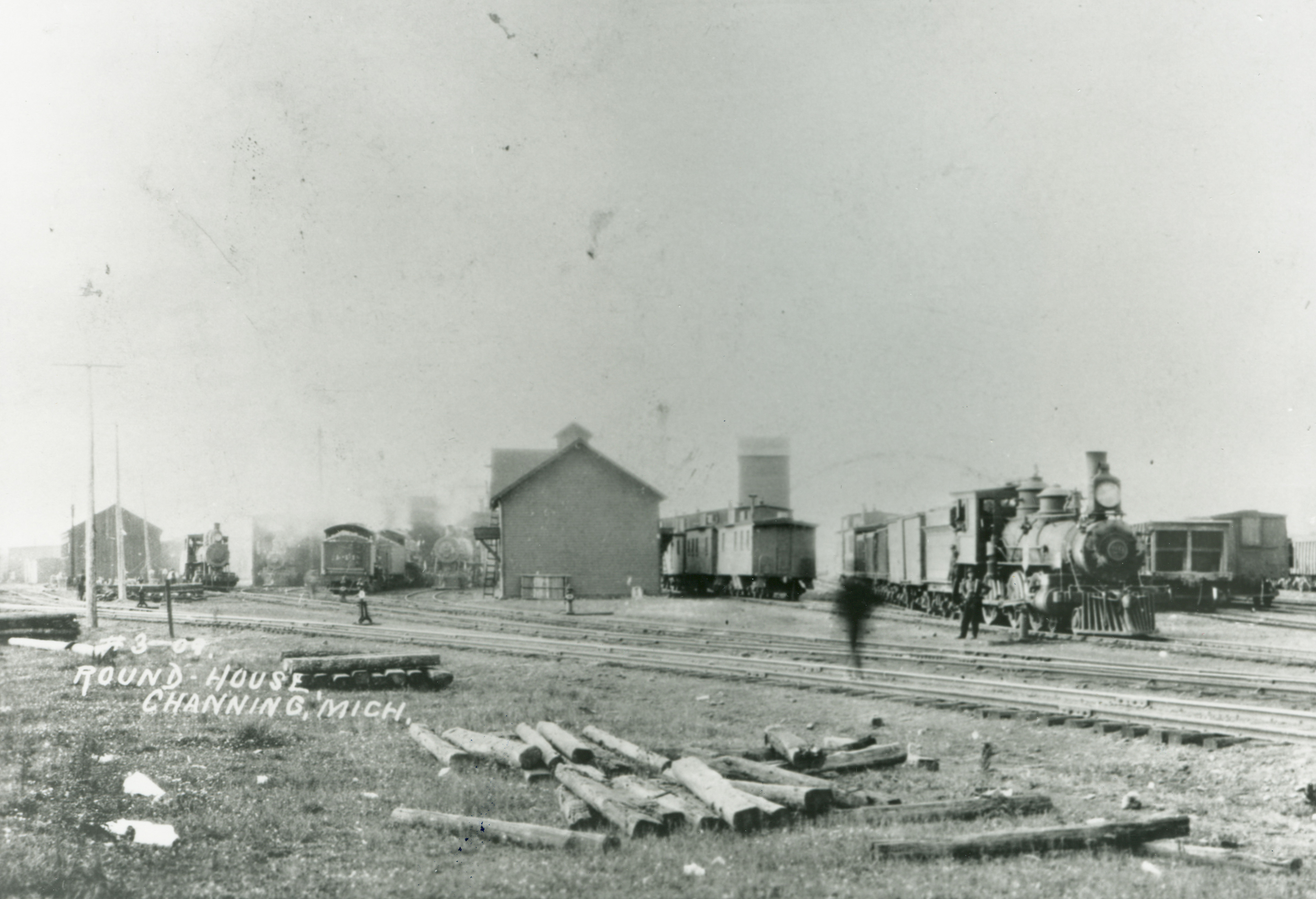 Photograph of Channing's railroad yards shows the round house, center, and other railroad buildings. Note the three steam engines and the railroad ties stacked and scattered in the foreground. 'Round House Channing, Mich.' is printed on the photograph.