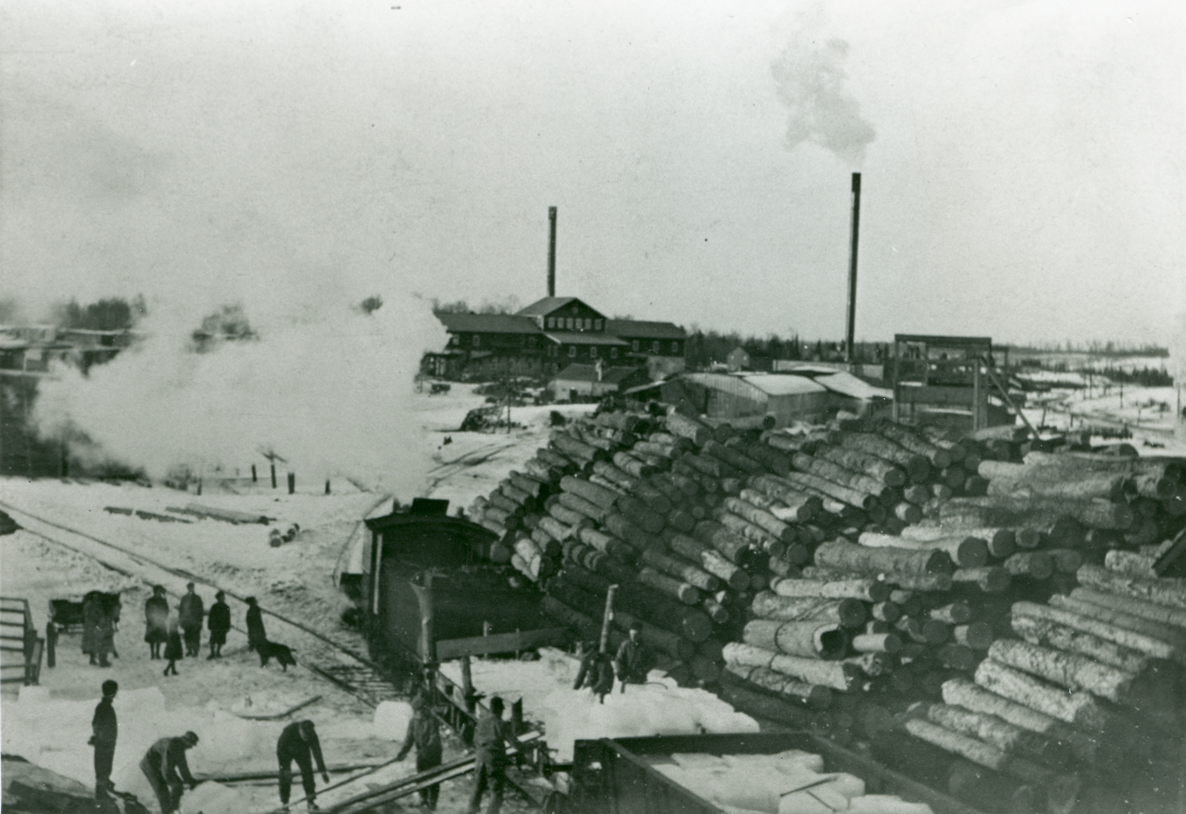 Photograph of the second Sagola Lumber Company sawmill which began operating March 28, 1911. It replaced the original sawmill which was struck by lightning in September, 1910. A fire which began in the cupola soon engulfed the entire structure. In this photo note the men in the foreground unloading blocks of ice from flatcars at the company store. Also note the immense piles of huge logs awaiting their trip through the sawmill to be converted into lumber.