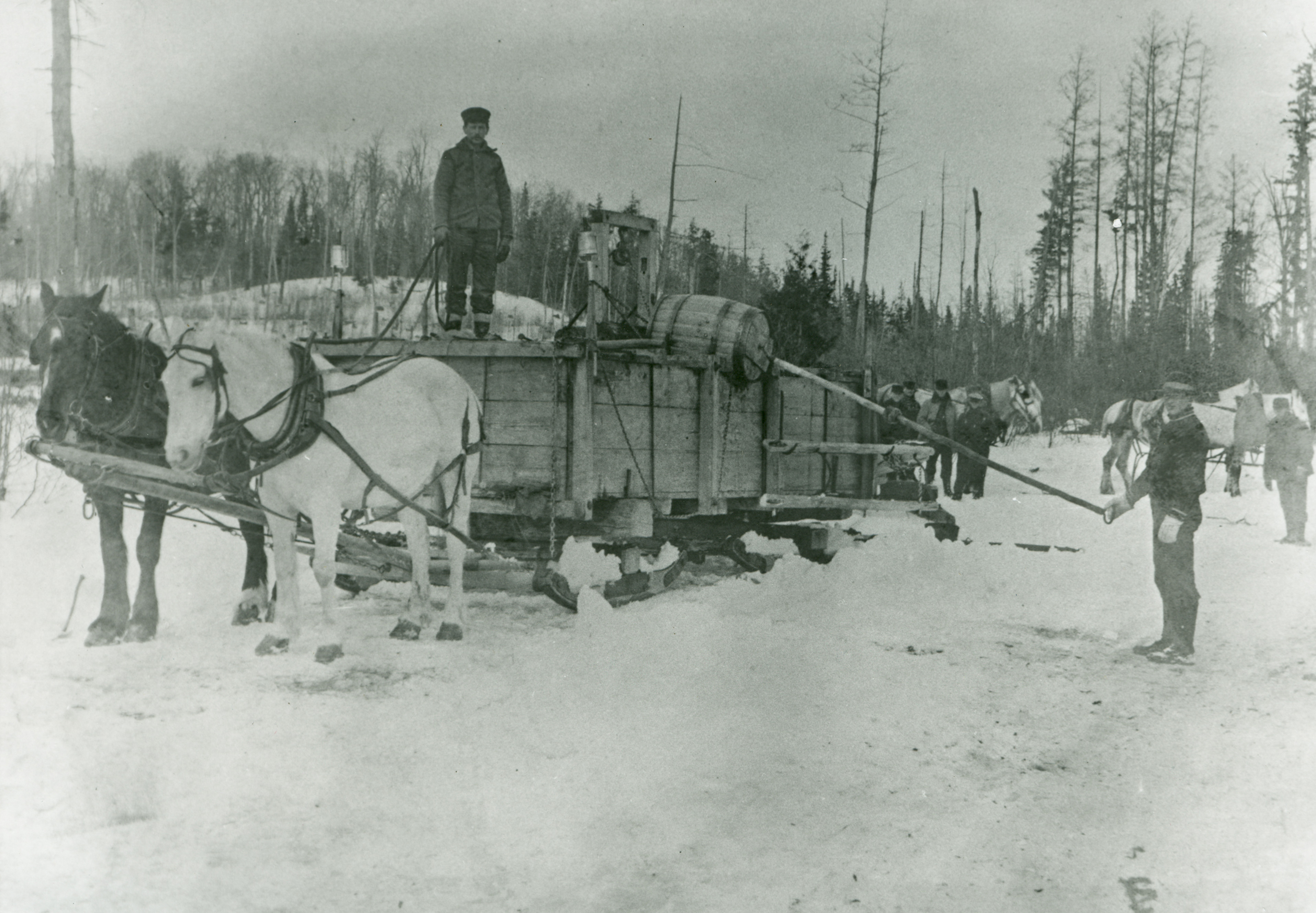 Photograph of a sprinkler sled at the Jauquet brothers' logging camp, which was used to make ice roads to facilitate hauling loads of logs.