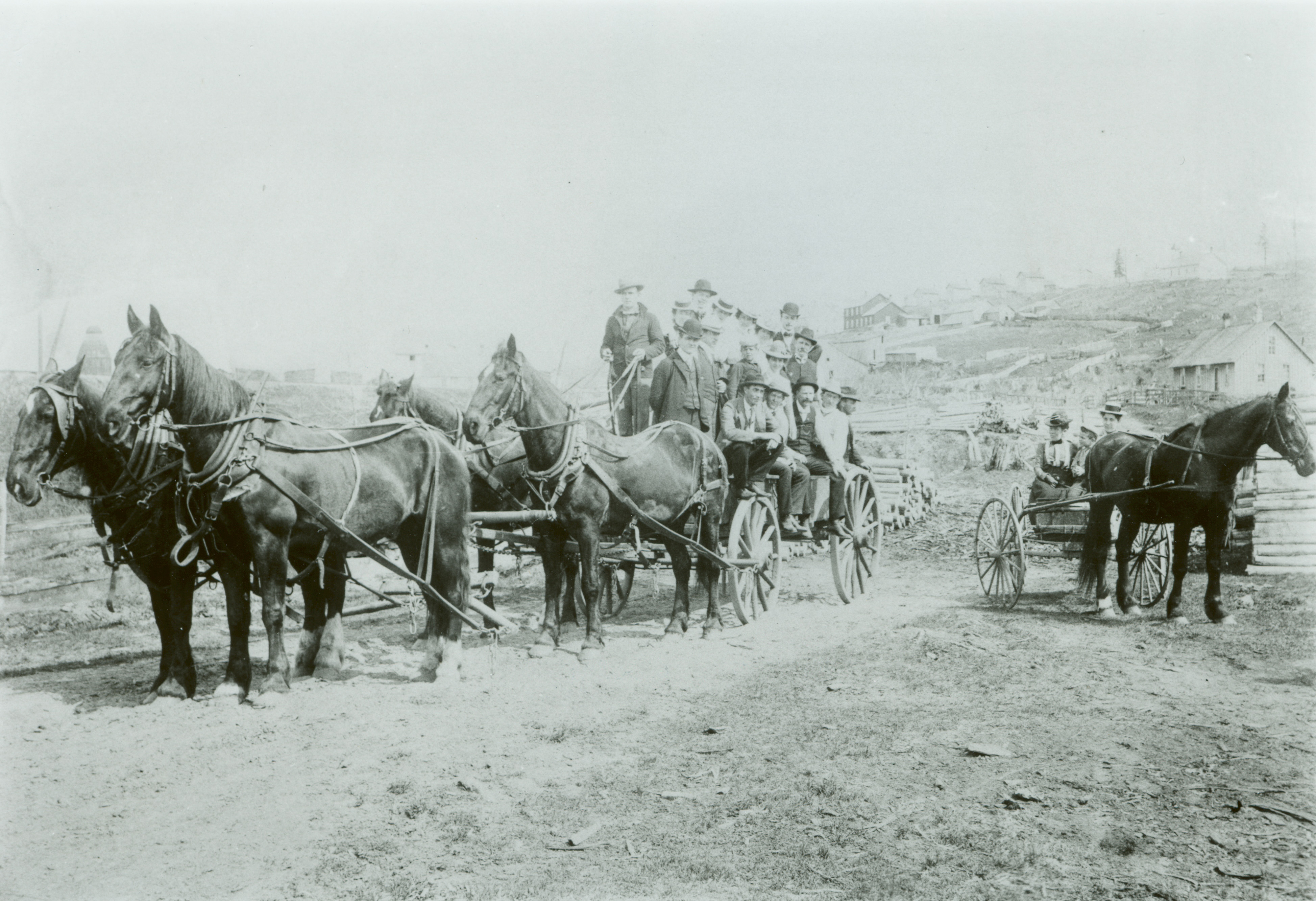 Photograph of Foster City residents returning from a picnic at Norway Lake. The cone-shaped sawdust burner from the Morgan Lumber and Cedar Company's sawmill can be seen in the distance between the heads of the two horses at the left. Houses on Boarding House Hill can also be seen in the background with the little schoolhouse barely visible at the upper right.