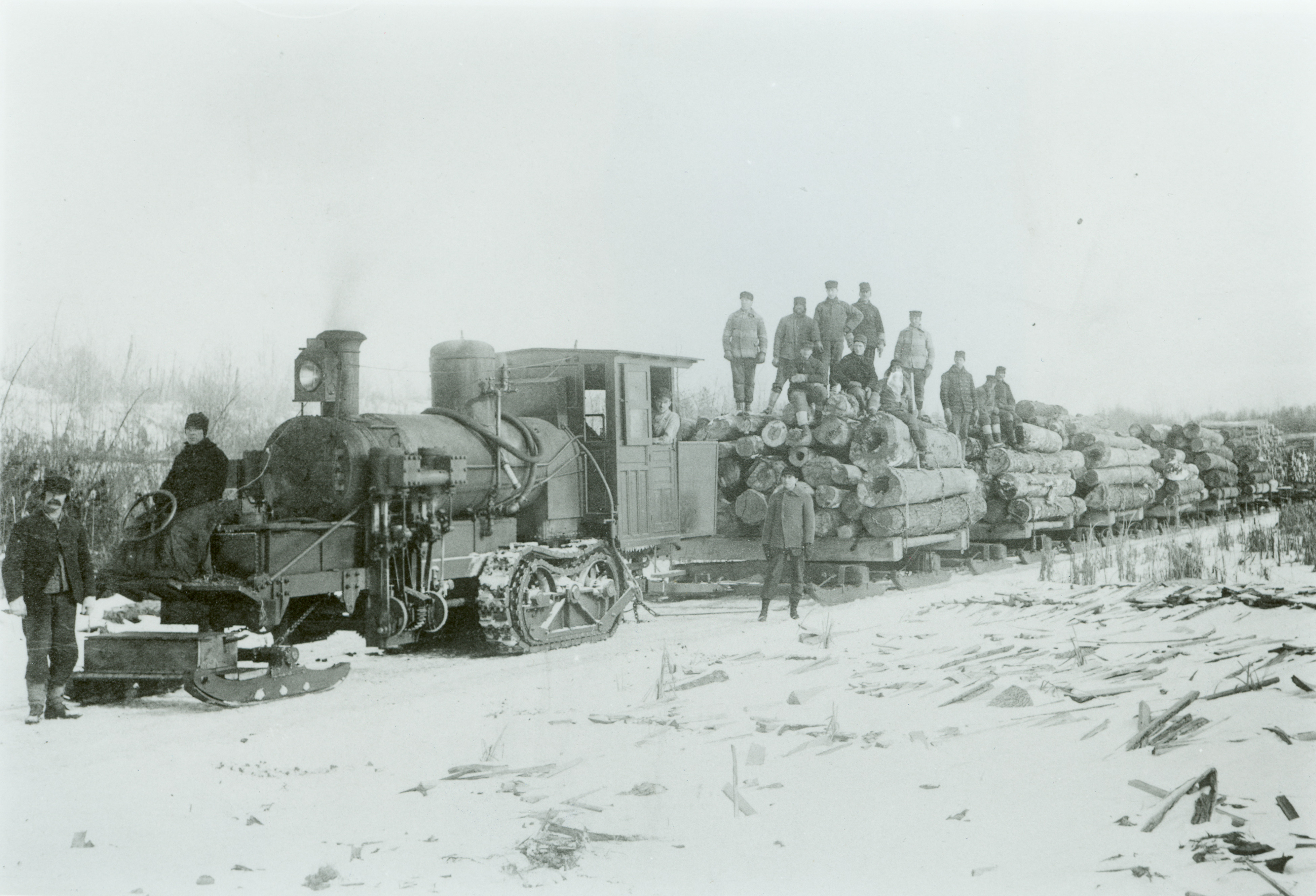Photograph of Foster City's Morgan Lumber and Cedar Company's steam hauling locomotive, which began operating in December, 1908. It could haul from eight to ten loads of hardwood logs, each of which would have required four teams of horses to pull. Patrick Milligan stands at the extreme left, at the wheel is 'Chicken' Wilson; Homer Grondine is seated in the cab and R.W. Pierce, company superintendent, stands on the ground in front of the first load.