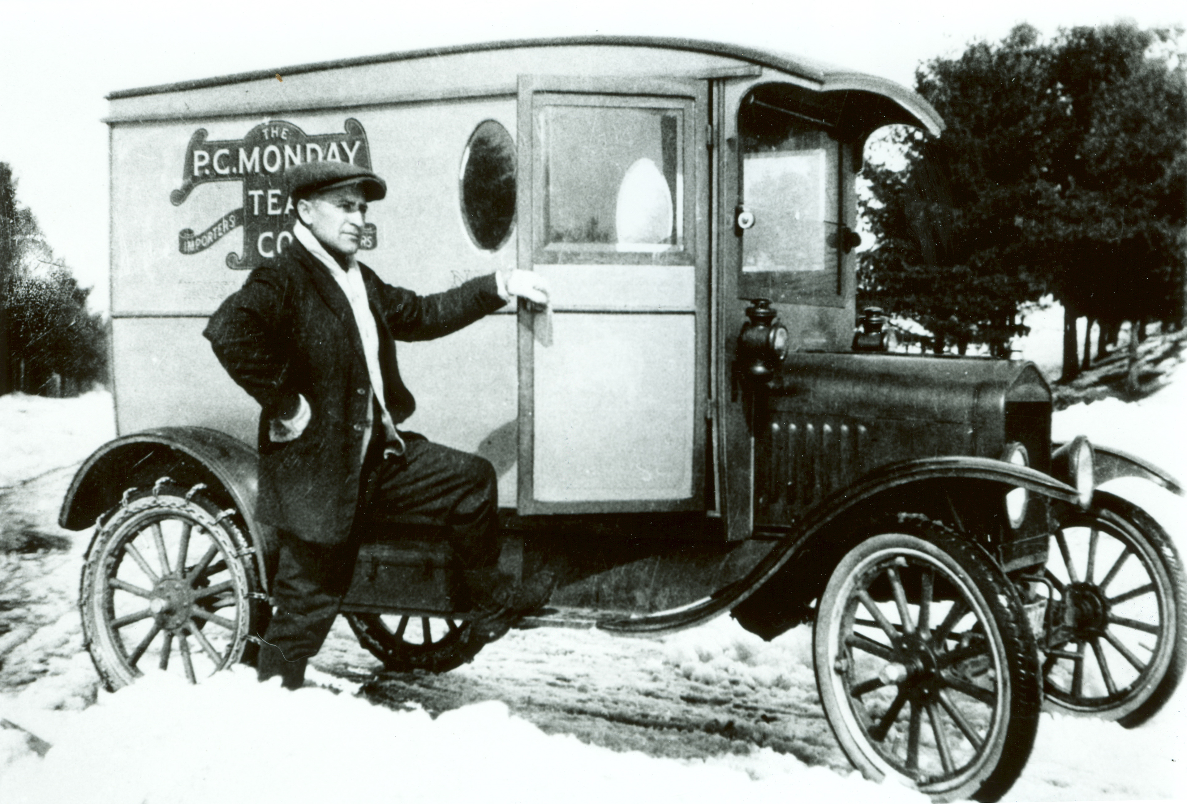 Photograph of George J. Desmarais, a route salesman for the P.C. Monday Tea Company. Note the chains on the rear tires for better traction during winter weather.
