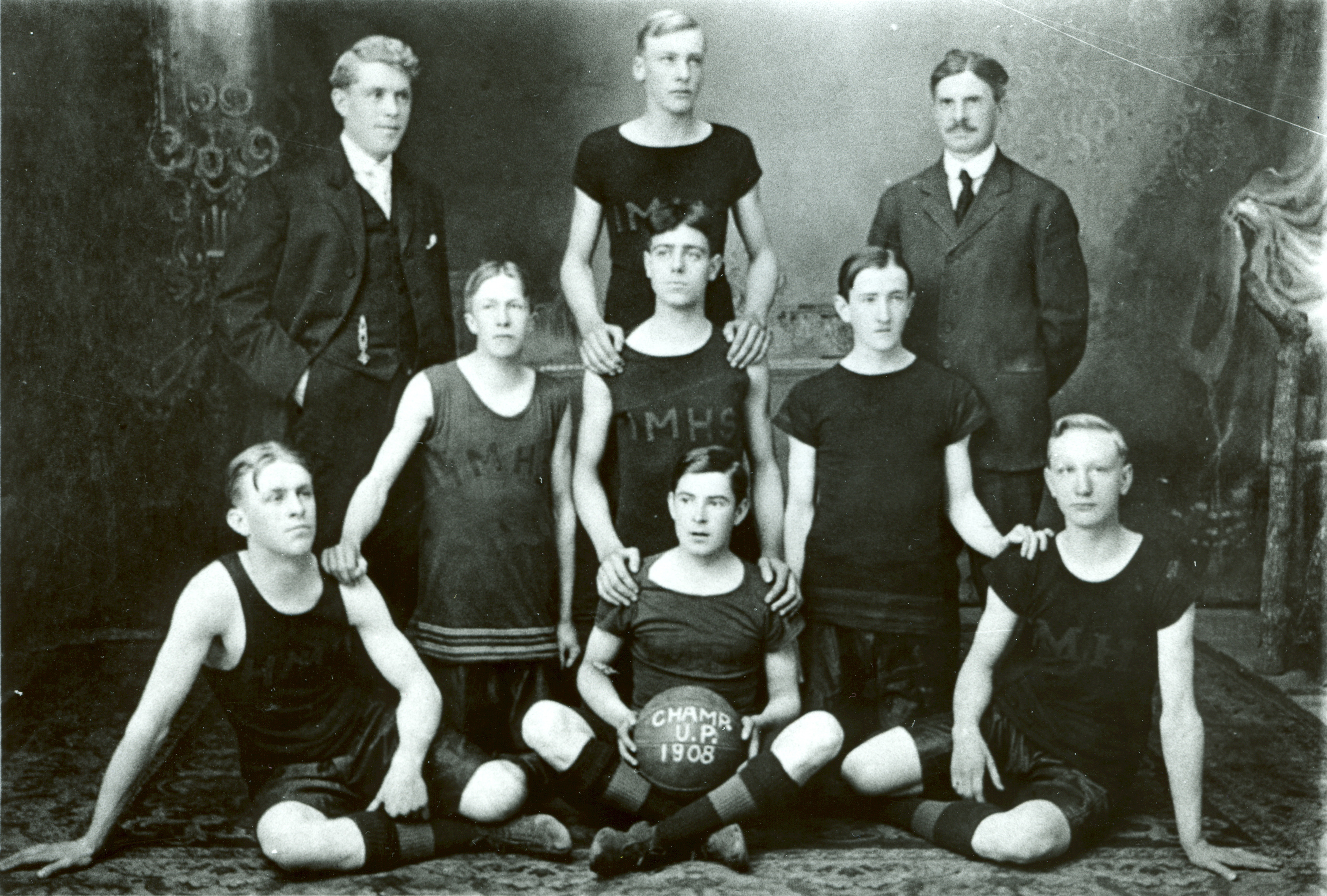 Photograph of Iron Mountain High School's first basketball team which won the Upper Peninsula cage championship during the 1907-1908 season. Standing, left to right, are Coach Rex Plowman, Henry Miller, Principal J.F. Reed; kneeling, left to right, Walter Nord, James Bemis, John Blackney; seated, left to right, Carl Israelson, Art McNanney and Harold Peterson.
