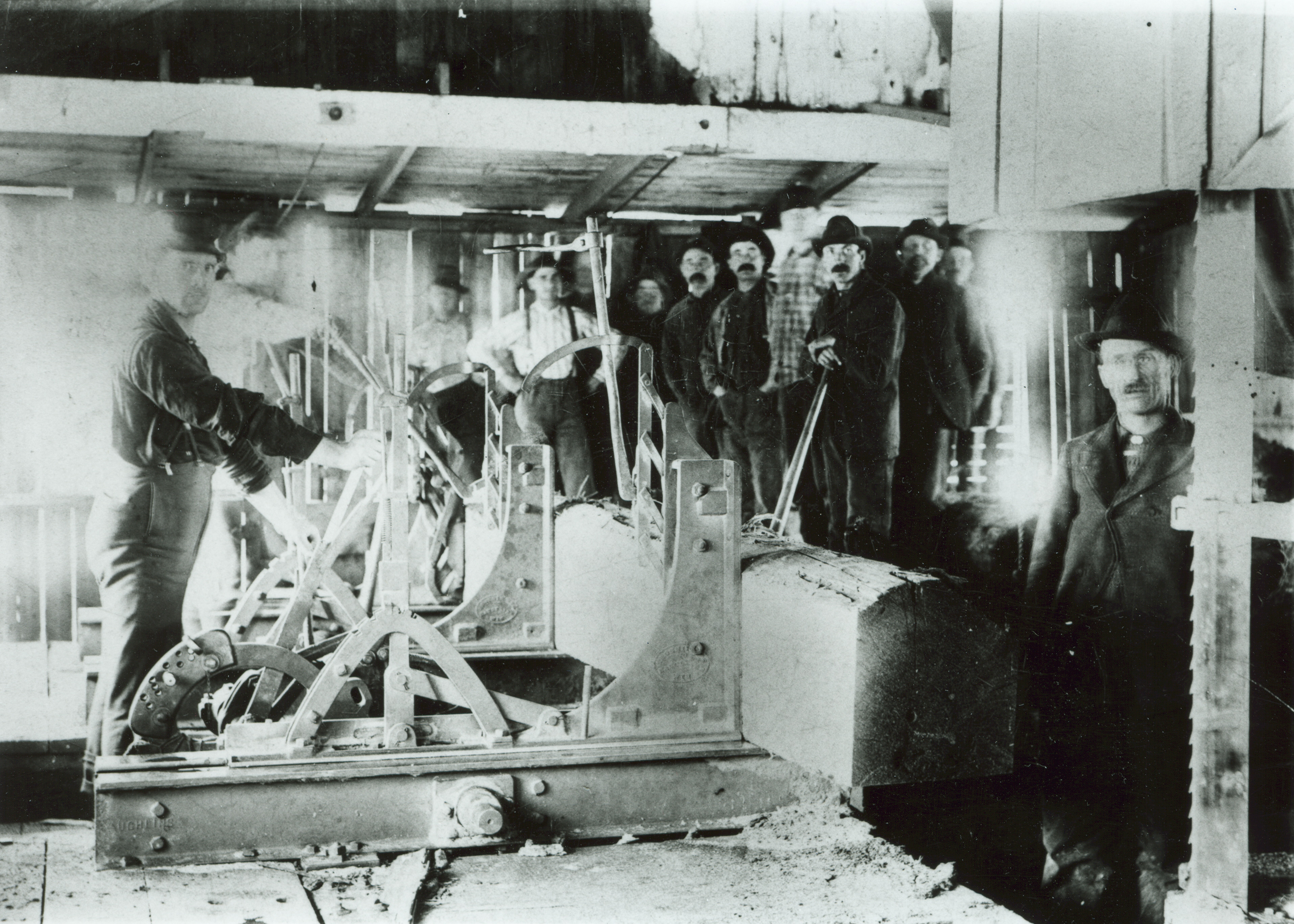 Photograph of the Parkinson Lumber and Cedar Company mill in Hardwood. This interior view shows the log in the carriage approaching the band saw at the right. Those identified include, from left to right, Olaf Olson, Louis Siegler, Sr., John LaLonde, unidentified and John Anderson.