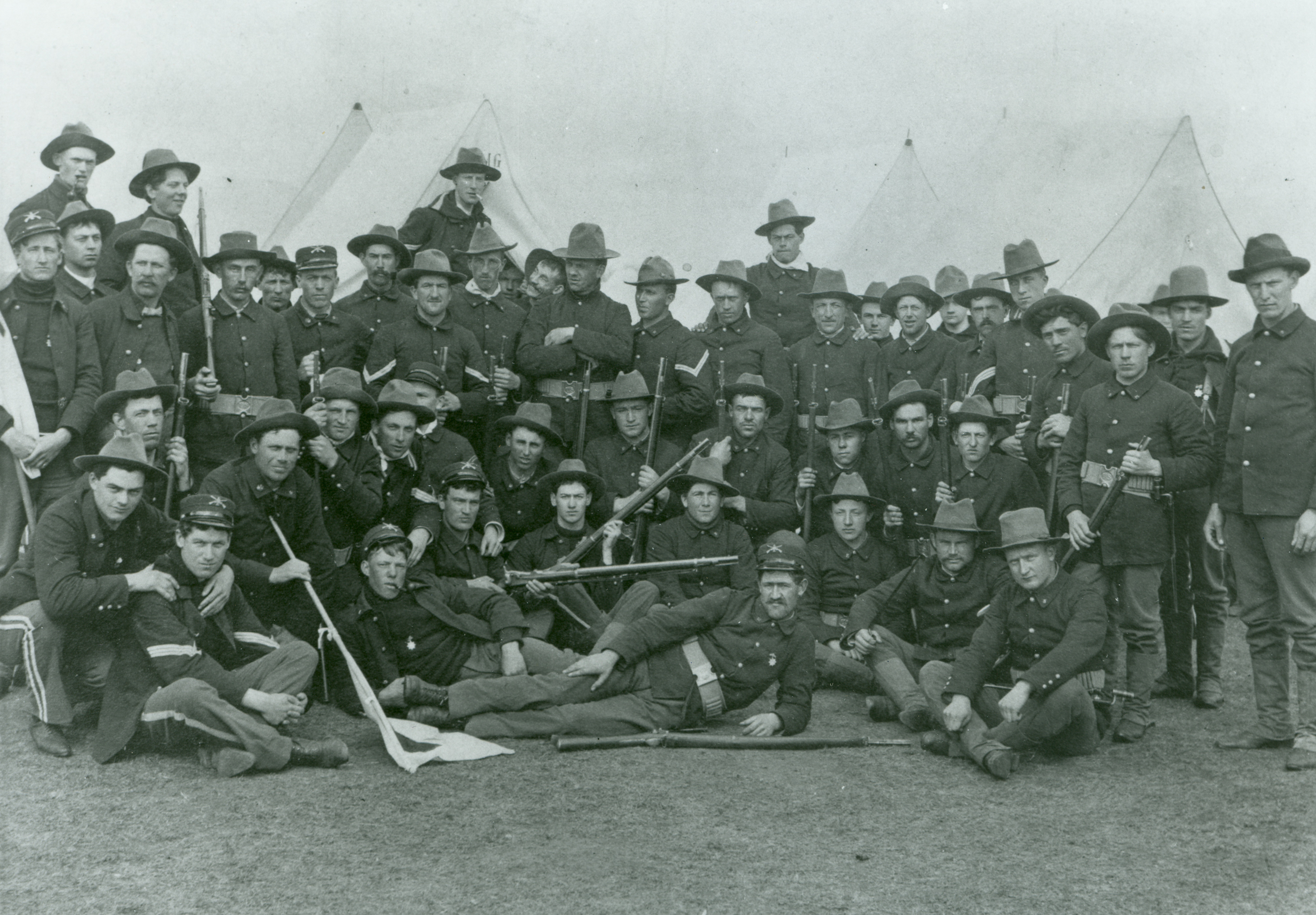 Photograph of the men of Company E of the 34th Michigan Volunteers from Dickinson County in 1898, during the Spanish American War. Eighty area men responded to the call.
