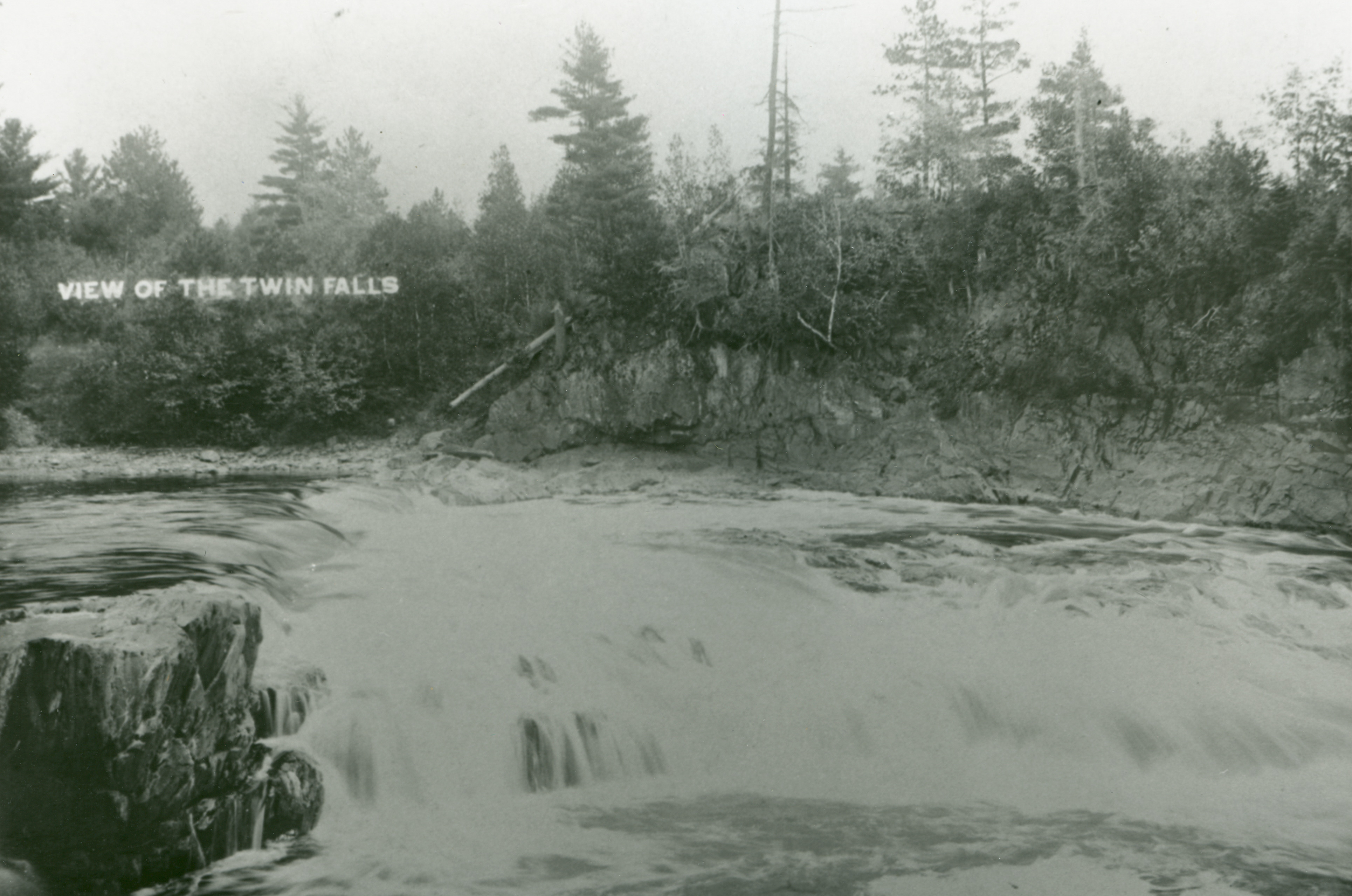 Postcard of Twin Falls, two small waterfalls within a mile of each other, which were flooded when a dam and power plant was established. The Indians called these falls 'Mossene Be-kinnegon, or the falls of the sharp rock.' 'View Of The Twin Falls' is printed on the photograph.