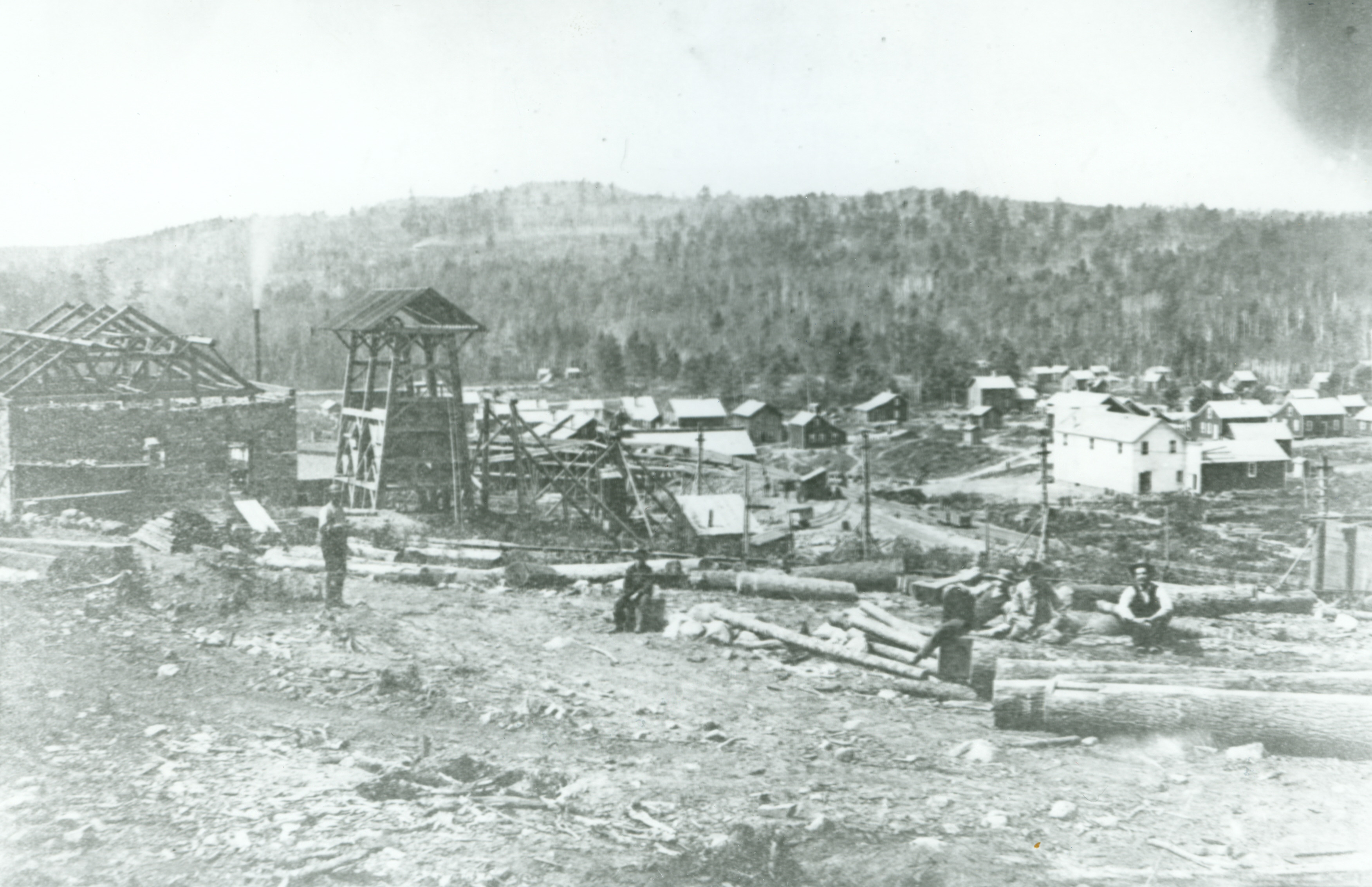 Photograph of early Iron Mountain taken near the Ludington Mine looking down to what is now the east side of the Chapin Pit. The large two-story white building at the right was the Menominee Mining Company Store for the Chapin Mine.