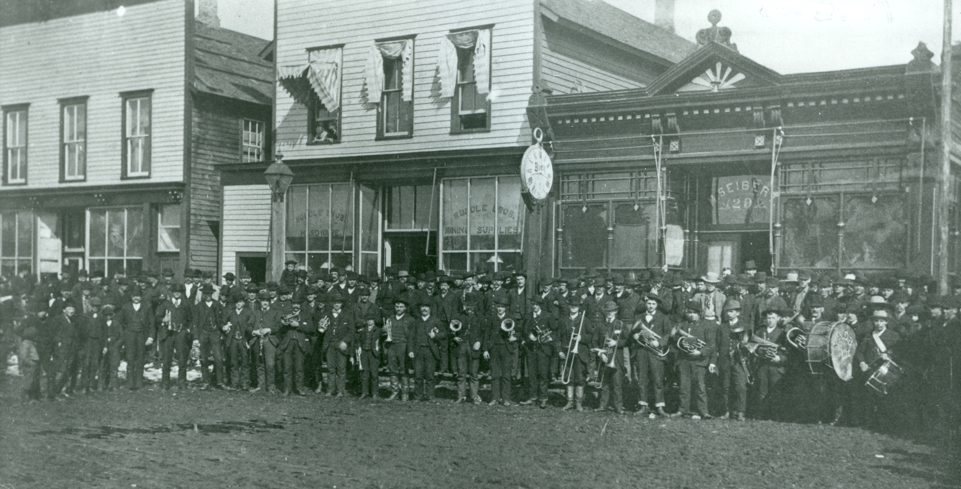 Iron Mountain band in front of Rundle Bros. Hardware & Seibert's Drug Store