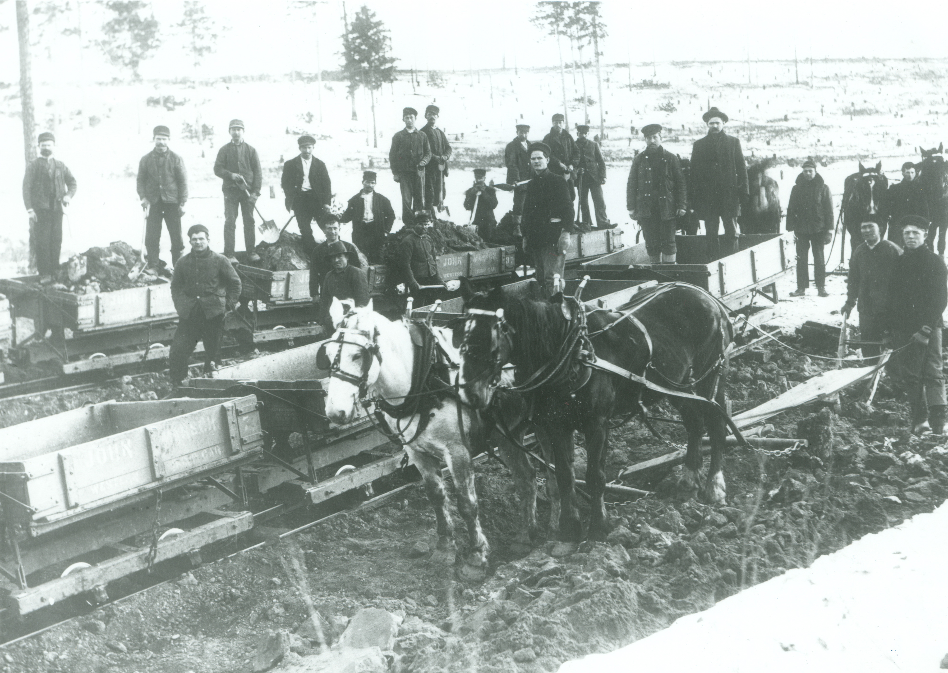 Photograph of a crew employed by John Marsch to extend the Wisconsin & Michigan Railway from Faithorn Junction to Norway in 1903. This photograph was probably taken as work progressed from Norway to Quinnesec.