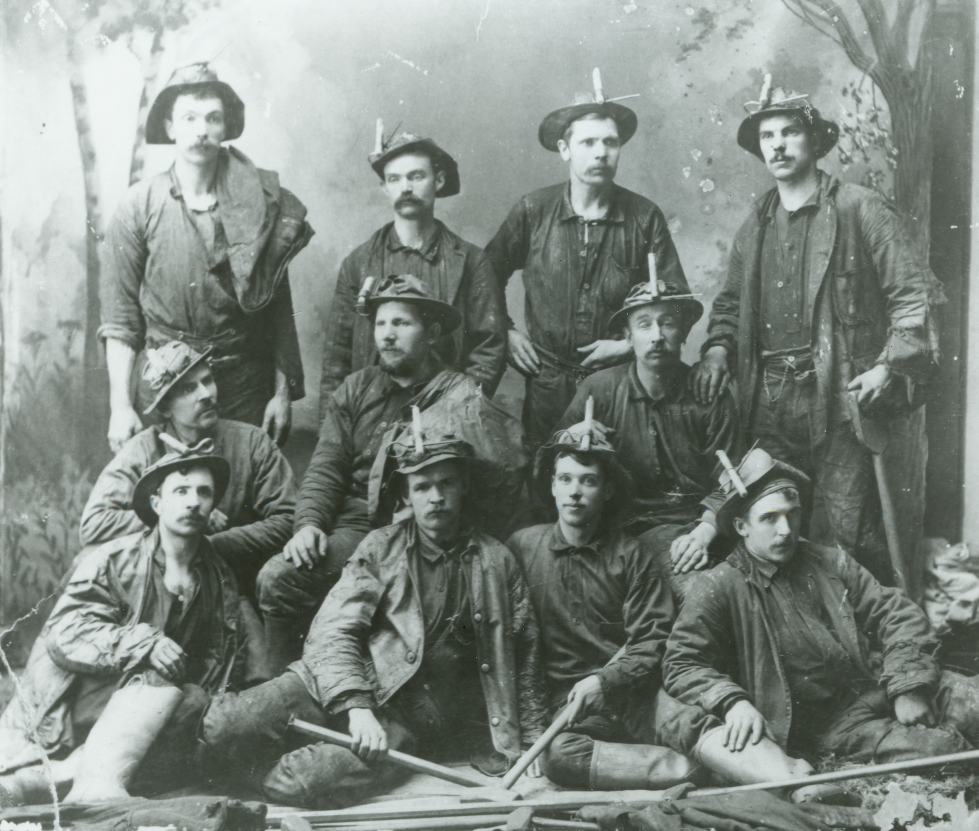 Photograph of eleven of the twelve men who were entombed while working on the fourth level of the Pewabic Mine, when a room above them collapsed in 1894. These eleven were rescued after over 40 hours; the twelfth man was crushed to death under the falling mass.