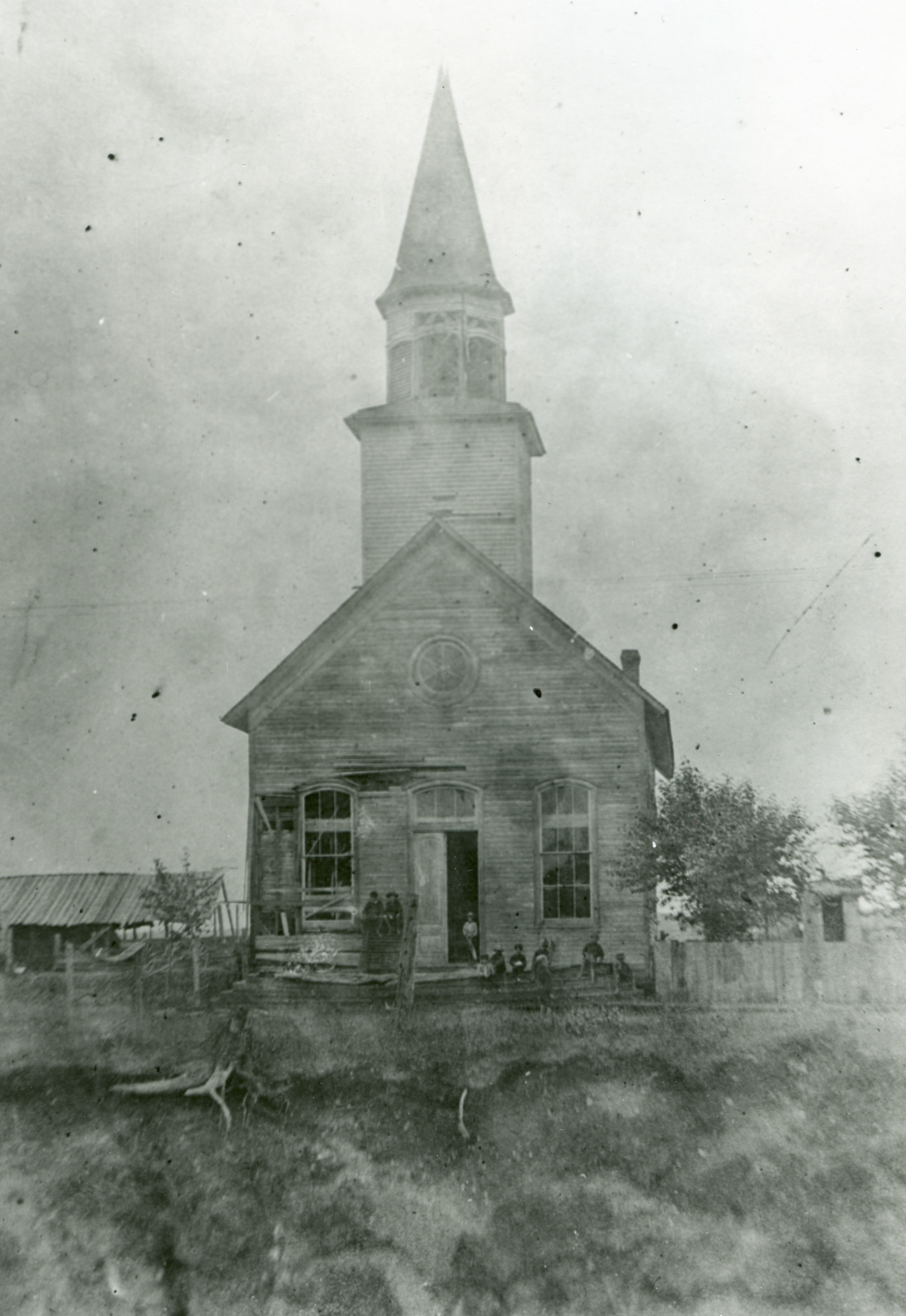 Photograph of the church of the Immaculate Conception located in Quinnesec, Mich. This photograph shows damage caused by lightning. The cross on top of the steeple was destroyed, part of the louvers were blown out of the bell tower and the front of the church and steps were damaged. The church was repaired and in use until destroyed by the Quinnesec fire in 1906.