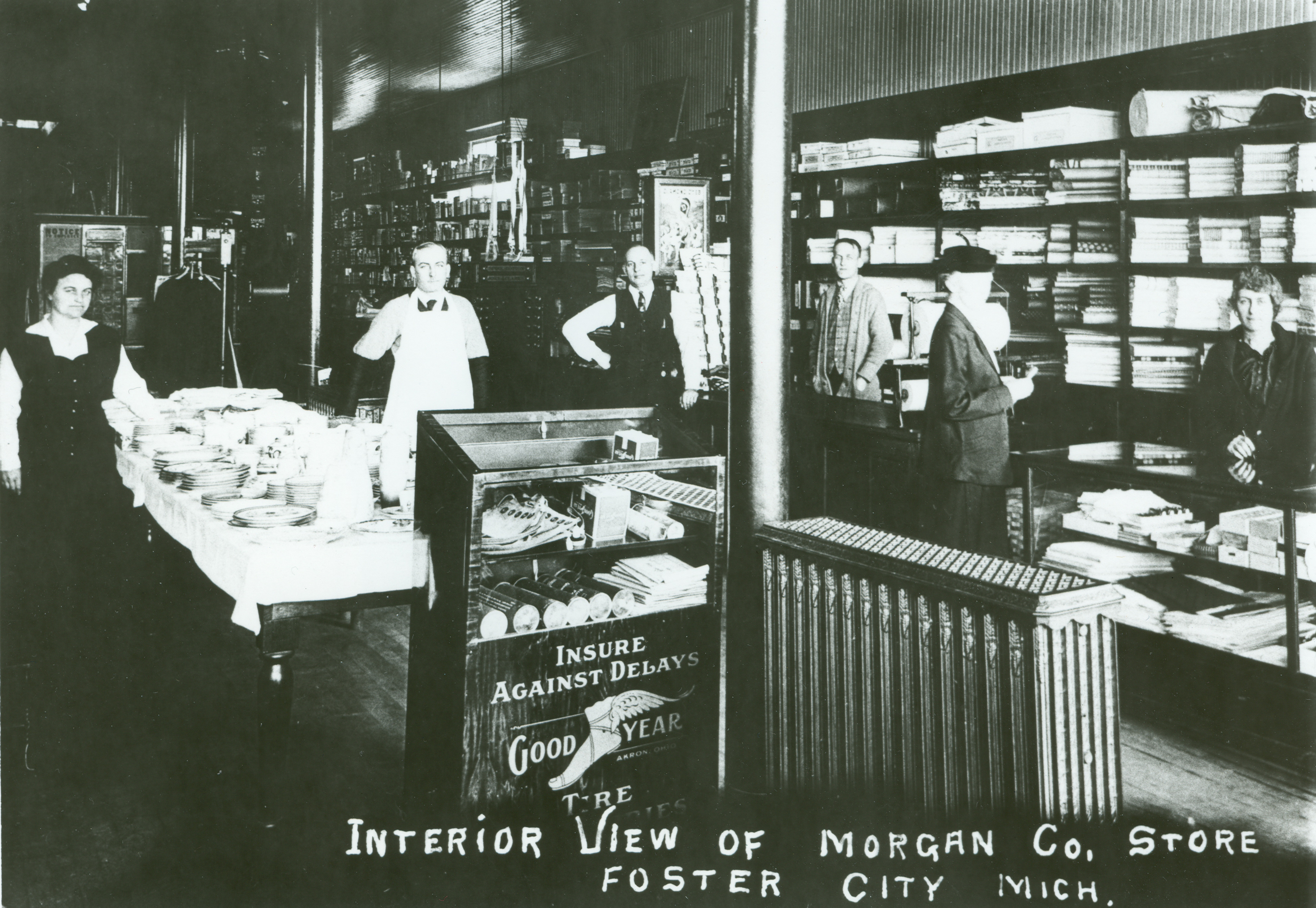 Photograph of the interior of the Morgan Co. store. Pictured are employees and customers posing in the general merchandise portion of the store. They include, from left to right, Mrs. Joe Kelly, Joe Kelly, one of the Hansen men, Mrs. Preston and Julie Lesnick. 'Interior View of Morgan Co. Store; Foster City Mich.' is printed on the photograph.