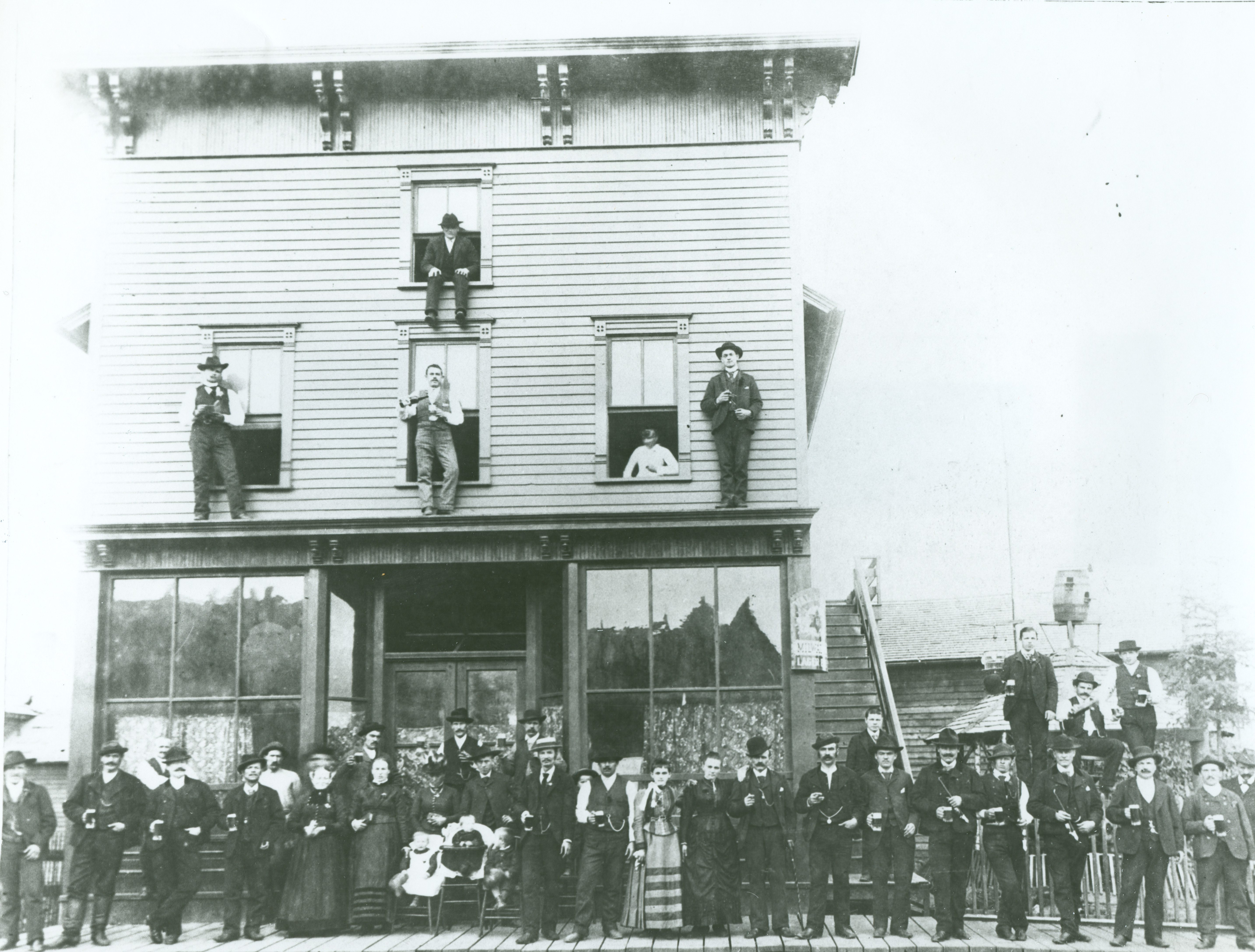 Photograph of the large crowd posing outside of John Pipp's saloon, located at 418 Millie Street on Iron Mountain's North Side.
