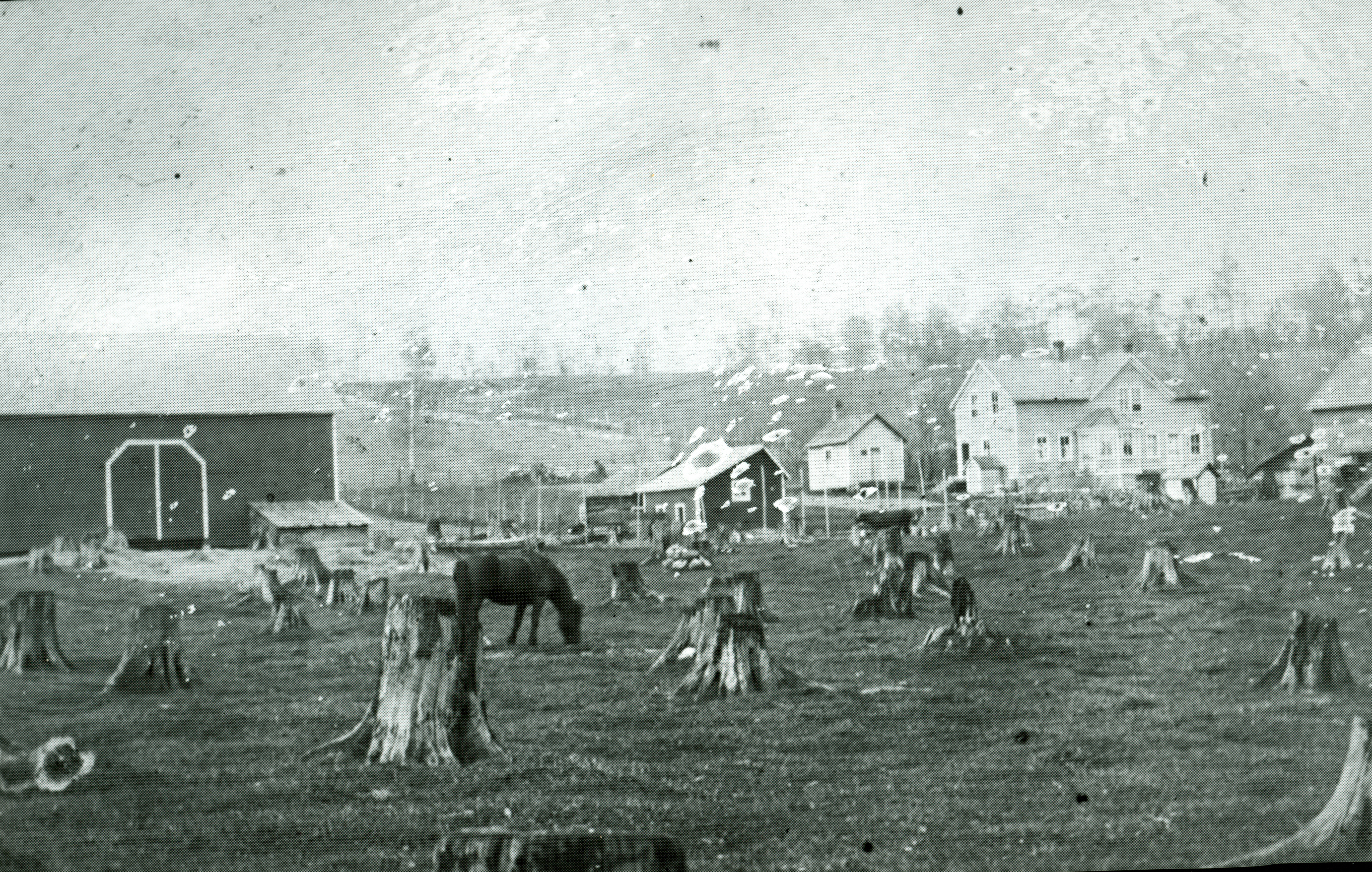Photograph of Erick Johnson's farm in Princeton, Felch Township. The farm consisted mainly of cut-over lands which were sold cheaply to people who remained in the area after the Metropolitan Lumber Company sawmill closed. The land, covered with stumps was used for pasture until the back-breaking job of clearing fields could be completed.