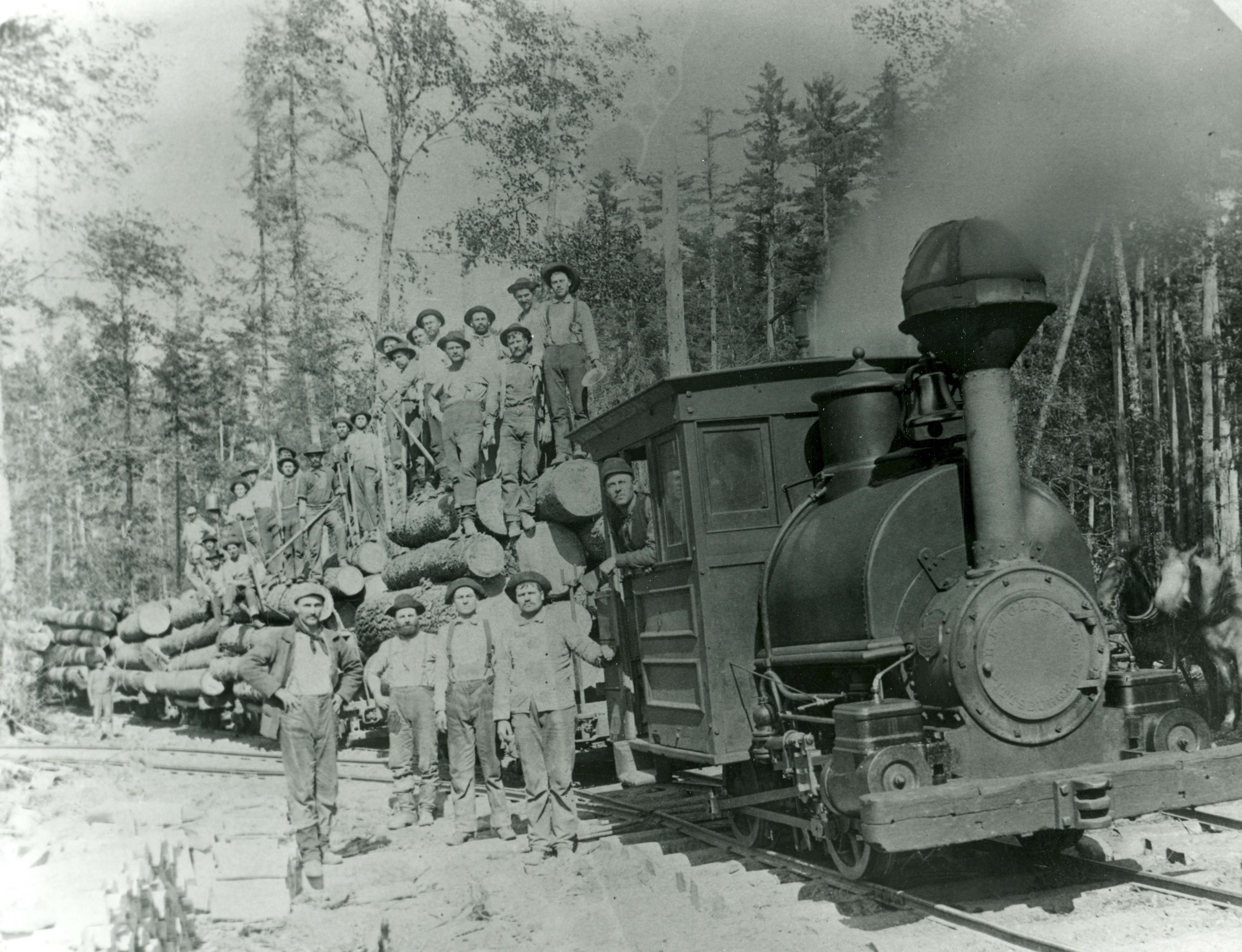 Photograph of William A. Holmes & Son crew, logging just across what became the Dickinson County line in Section 26 of Township 43 North, Range 31 West. Note the primitive narrow gauge steam engine, a 9-ton wood burner, which was used to pull carloads of pine logs.