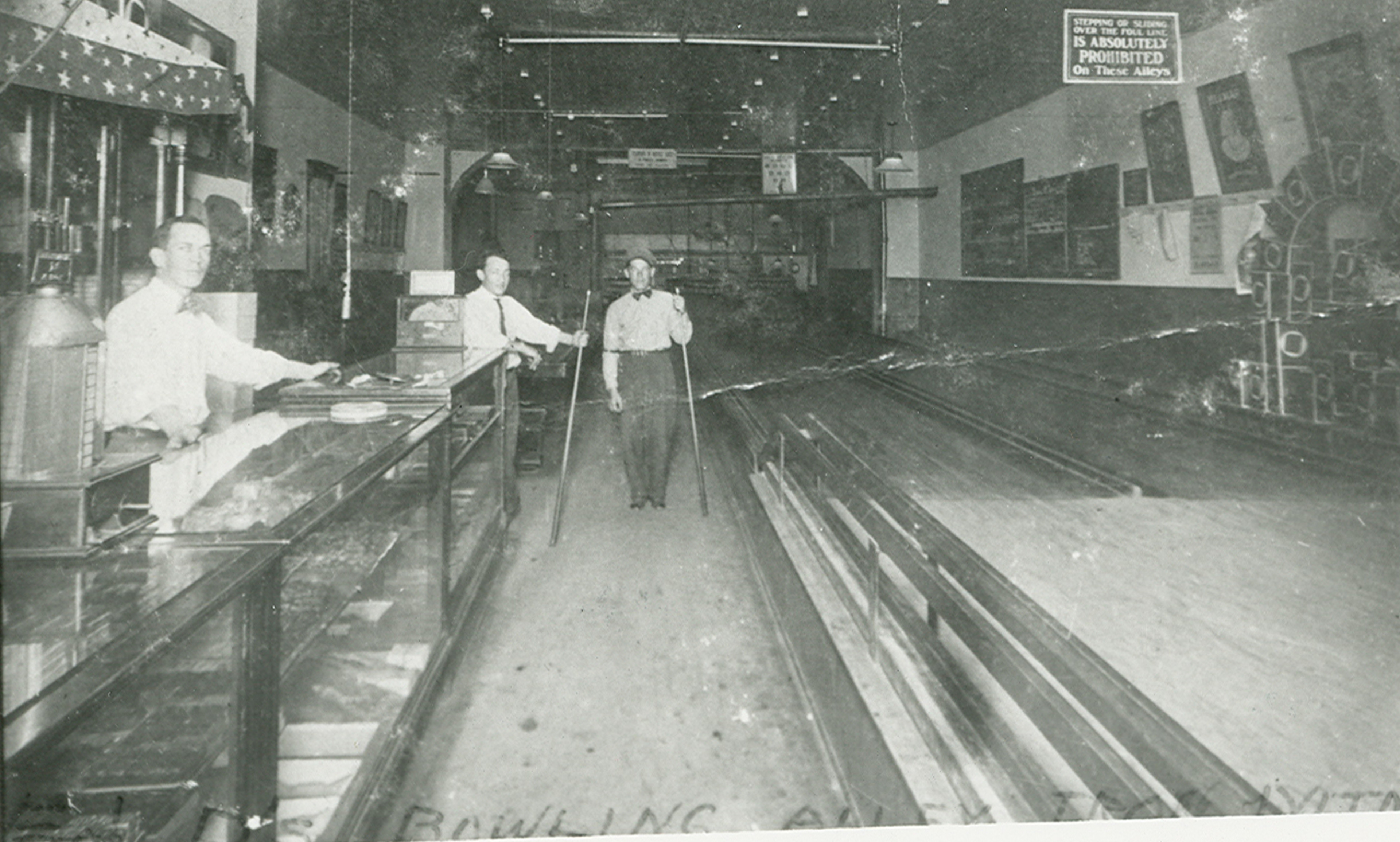 Photograph of Eugene J. DeGayner's billiard and pool room, located in the Parent building at 219 South Stephenson Ave. This photograph, taken in about 1913 when DeGayner's establishment was know as The Club. The man standing behind the counter may be Frank Morett, but the two pool players are unidentified.