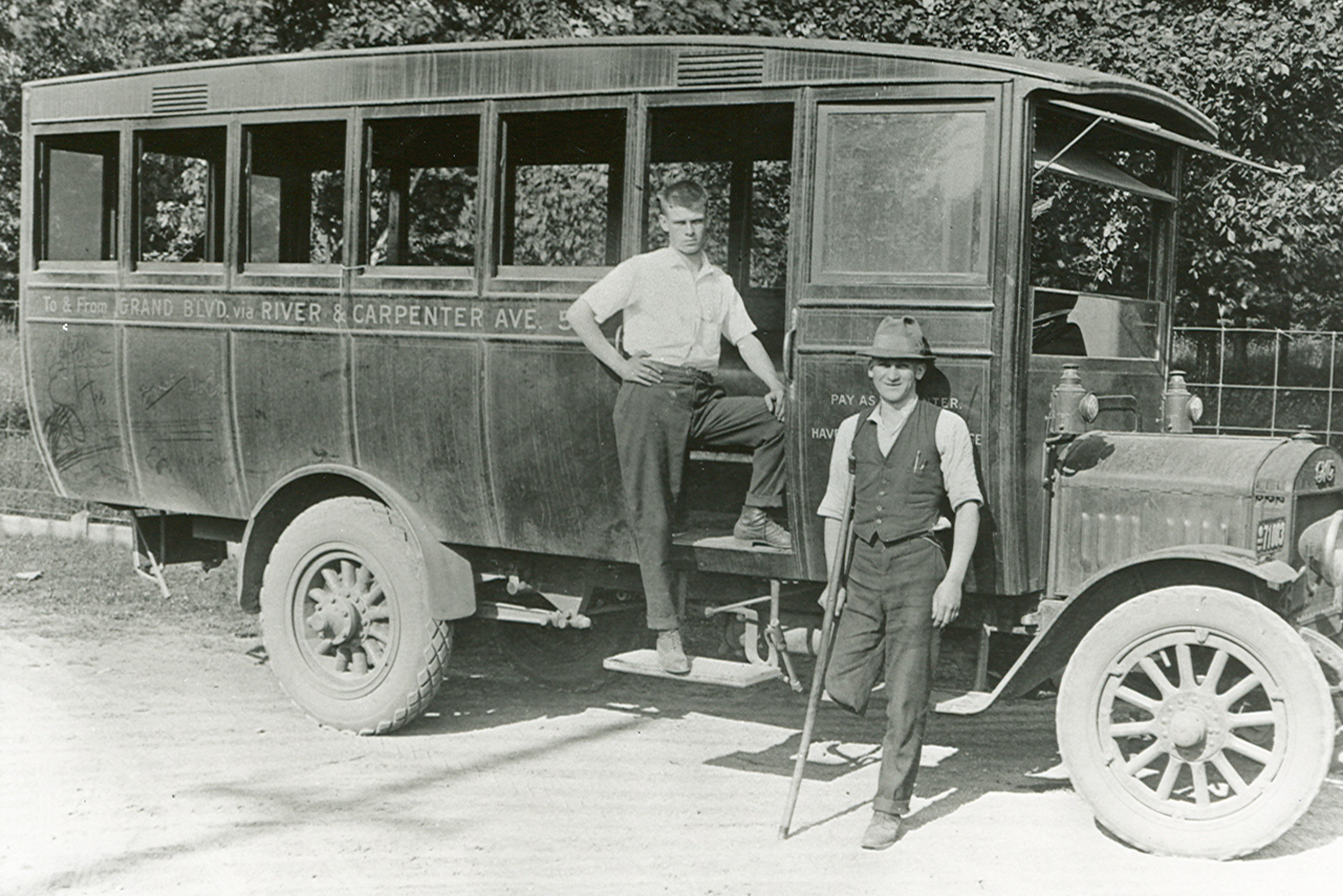 Photograph of Andrew Bjorkman's jitney bus that traveled to and from Grand Blvd. via River & Carpenter avenue. The man standing at the bus door is unidentified, but the man with the crutch was Peter 'Peggy' Merzlac. The ride cost five cents, payable when entering the vehicle.