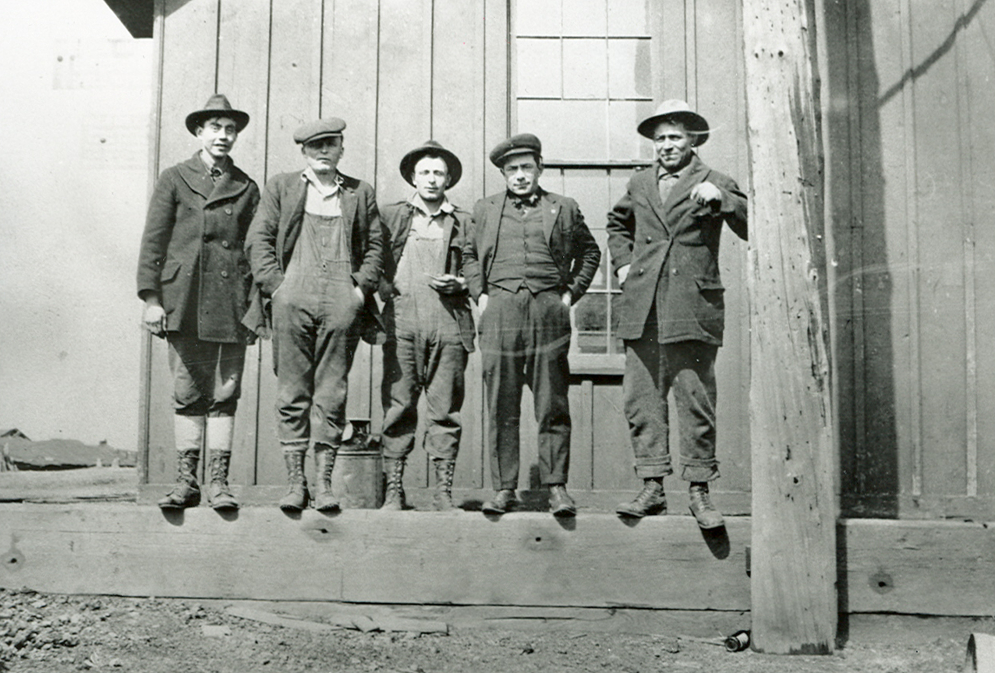 Photograph of gentlemen standing at the Waucedah Depot in about 1920 are, left to right, Louis Tebeau, Paul Bottesi, Mack Valentine and Emil Huff.