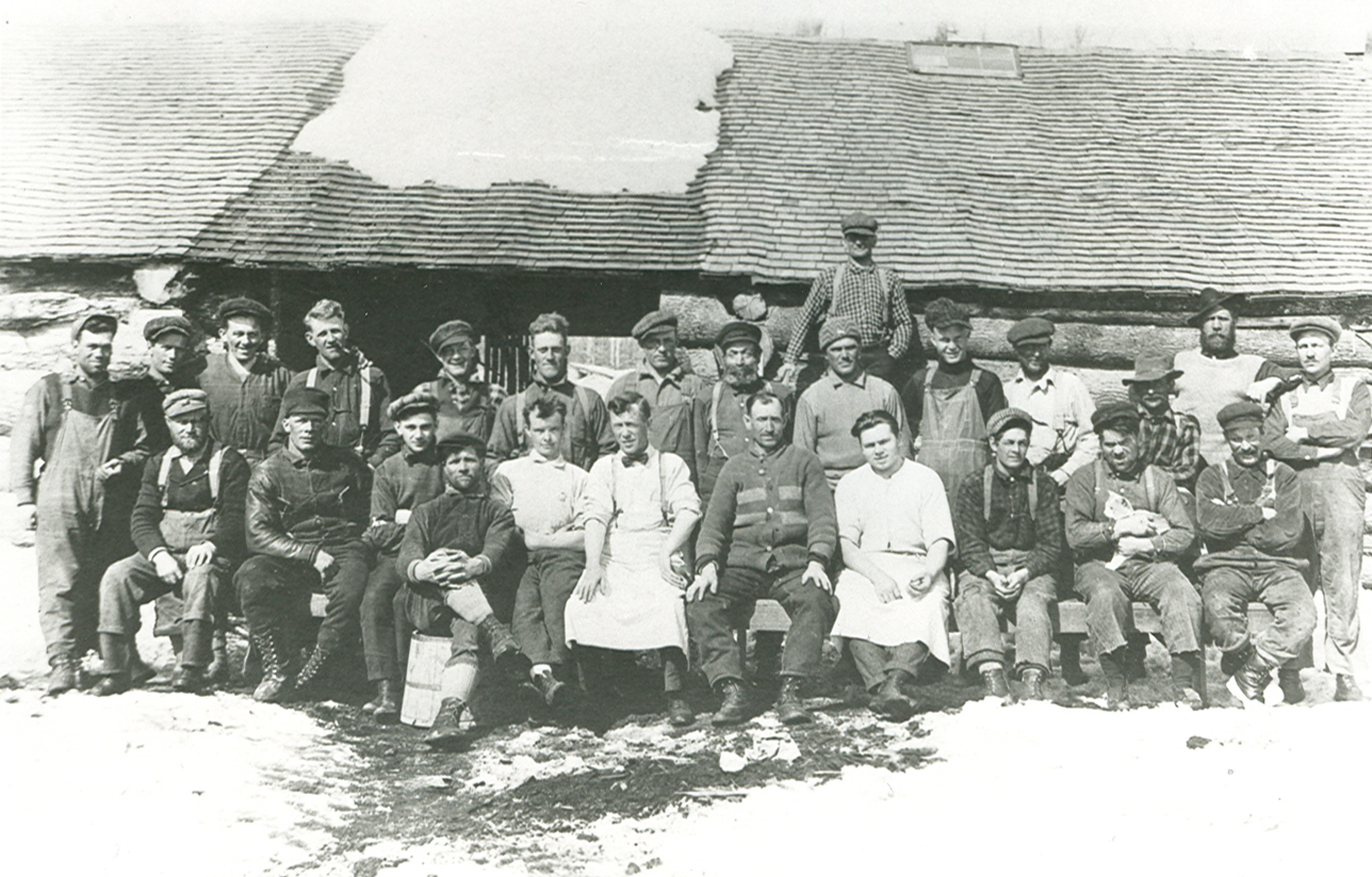 Photograph of lumberjacks and kitchen crew posing outside of Olaf Olson's camp at Norway Lake in 1919.
