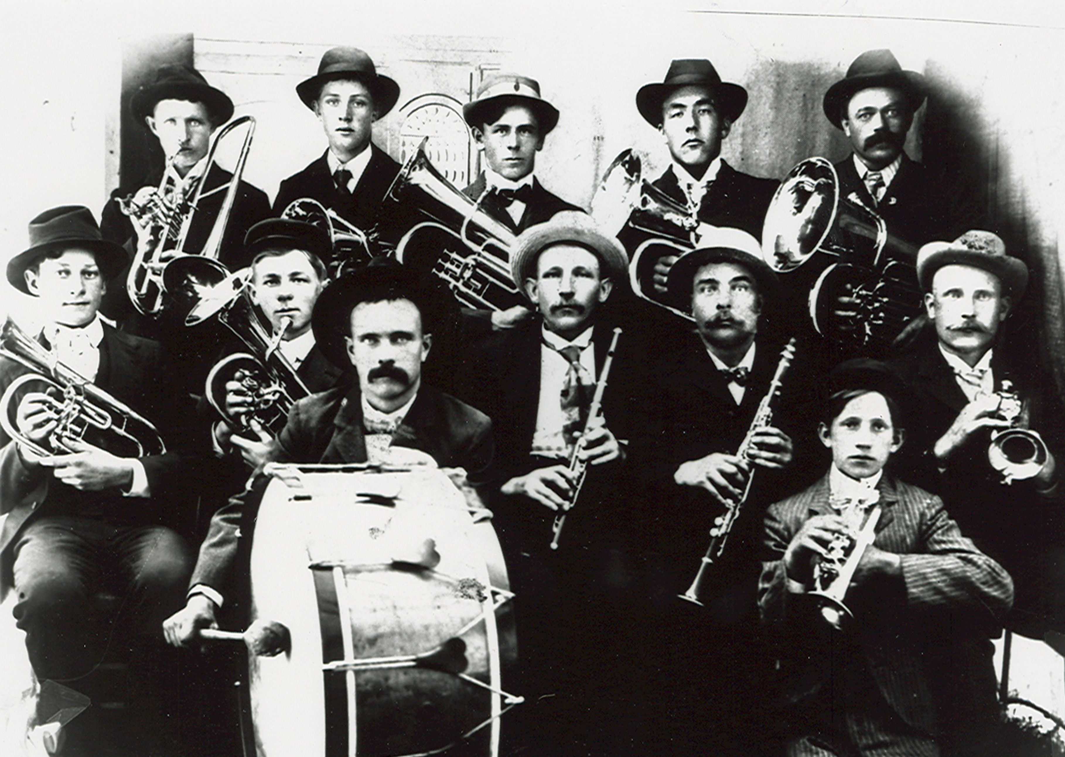 Photograph of the members of the Metropolitan band, posing in about 1910. Included are, standing left to right, Gust Knutsen, Arthur Anderson, John Kintgen, Ingelbrect Swanson, Peter Peterson; seated, left to right, William Nashlund, Olaf Rian, Iver Eggen (drummer), Alex Johnson, Joe Lindstrom (leader), Fred Dixon and Charles Branstrom.