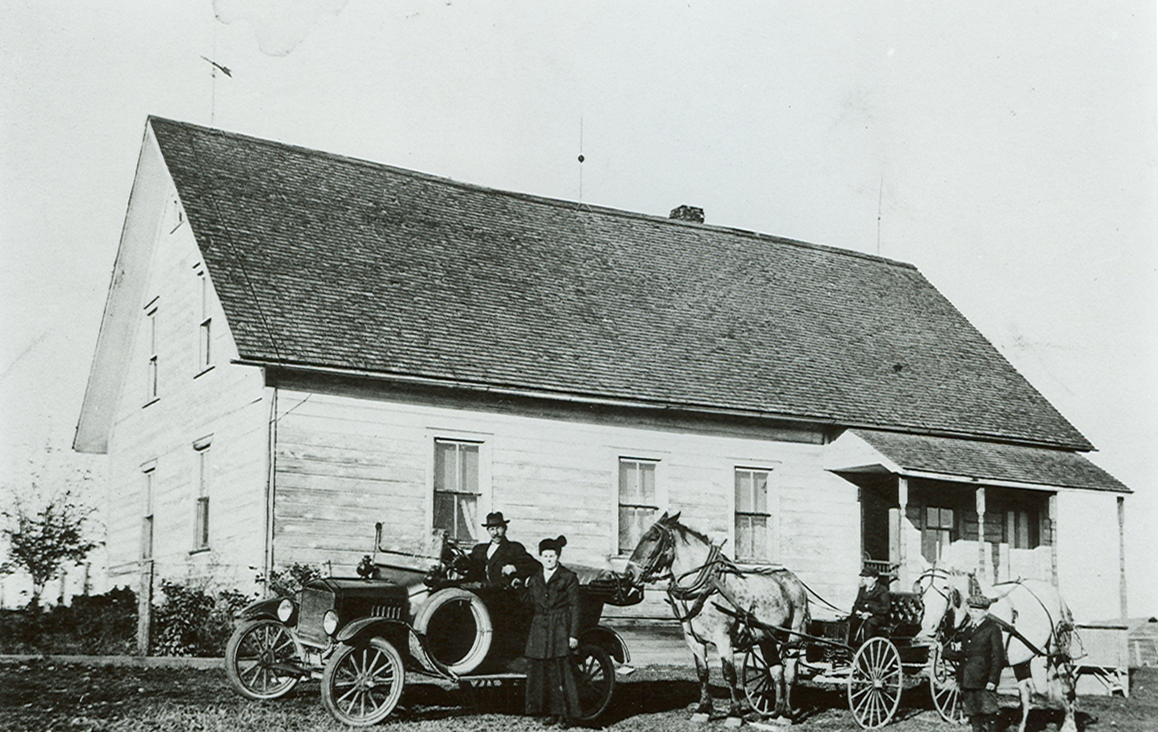 Photograph of old and new modes of transportation in front of the homestead of Mr. and Mrs. Jake Johnson. Jake Johnson is seated in the automobile and his wife is standing next to it. Their son Emil is seated in the buggy and Olaf, another son, holds the bridle of the unhitched horse.