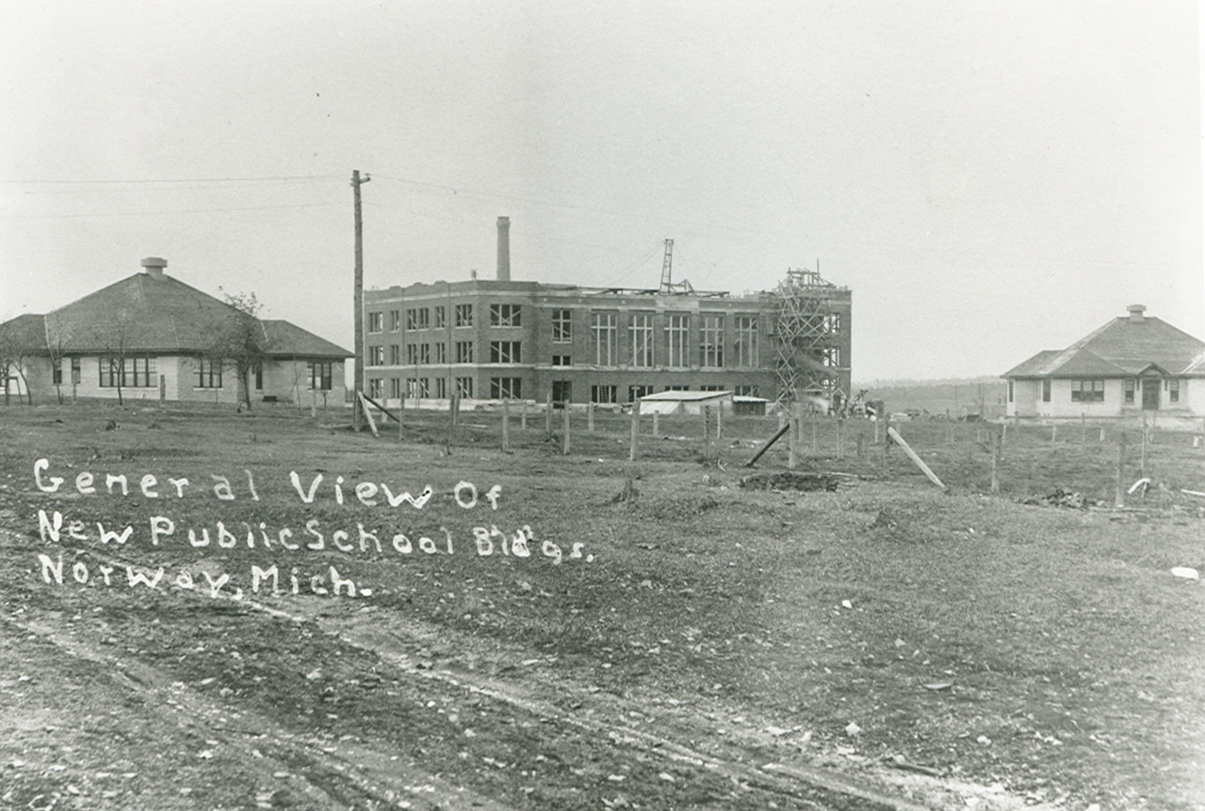 Postcard view of the new Norway High School building which replaced the one which burned in 1912, while under construction. Two elementary school buildings flank the new high school. All three buildings were razed in 1991 and 1992 to make room for the new Norway public school complex. 'General View Of New Public School Bldgs. Norway, Mich.' is printed on the photograph.