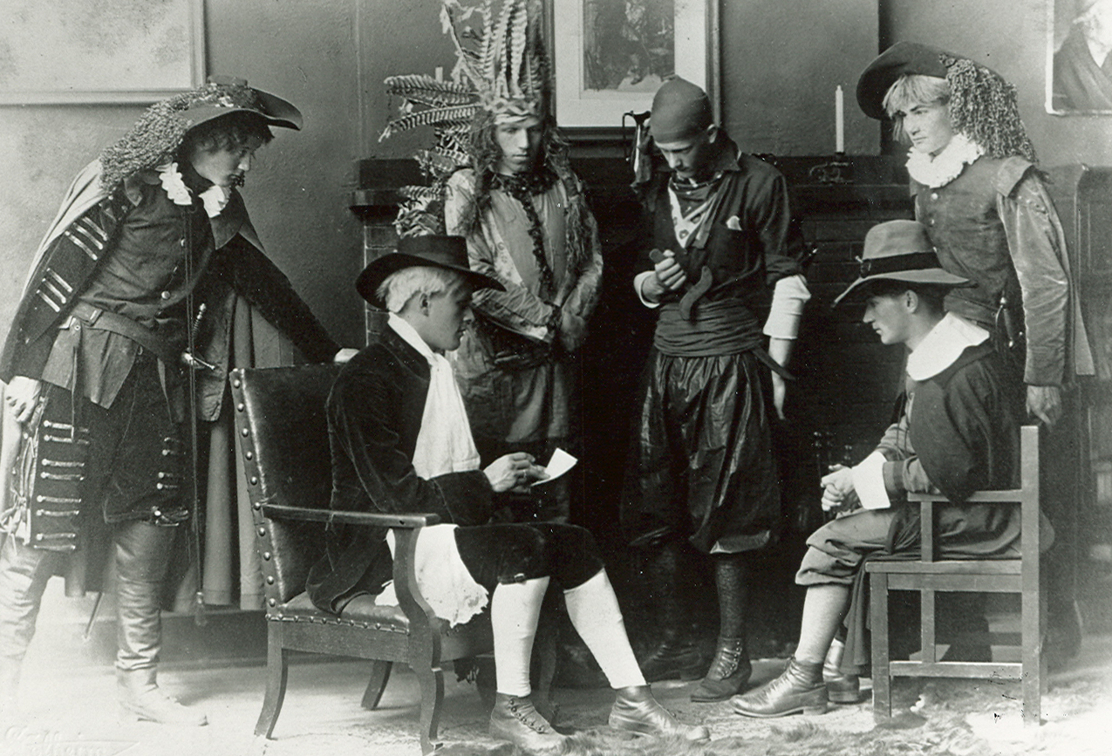Photograph of Norway High School students performing the operetta 'The Captain of Plymouth' at the Norway City Hall auditorium in 1913. The cast included Ella Blomgren as Priscilla, Paul Soderlund as the Captain of Plymouth, Thomas Cuff as Erasmus, Harold Lindahl as John Alden, Catherine Calcaterra as Mercy, Irene Van Kerckhove as Katonka and Will Elliason as Chief Waftawamuth.