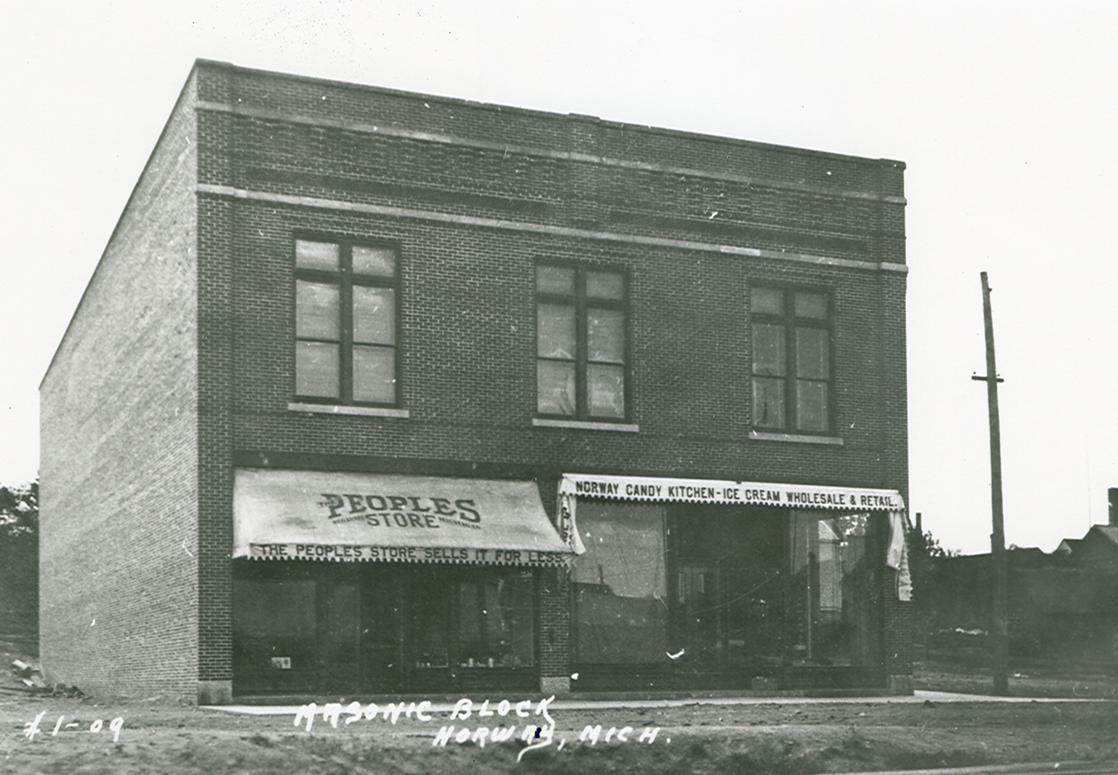 Postcard view of Norway's Masonic block which was located at the southwest corner of South Nelson Street (now Main Street) and Frederick Street. The two store rooms on the first floor of the two-story brick building housed the People's Store and the Norway Candy Kitchen. The lodge rooms were on the second floor. '* 1 - 109; Masonic Block Norway, Mich.' is printed on the photograph.