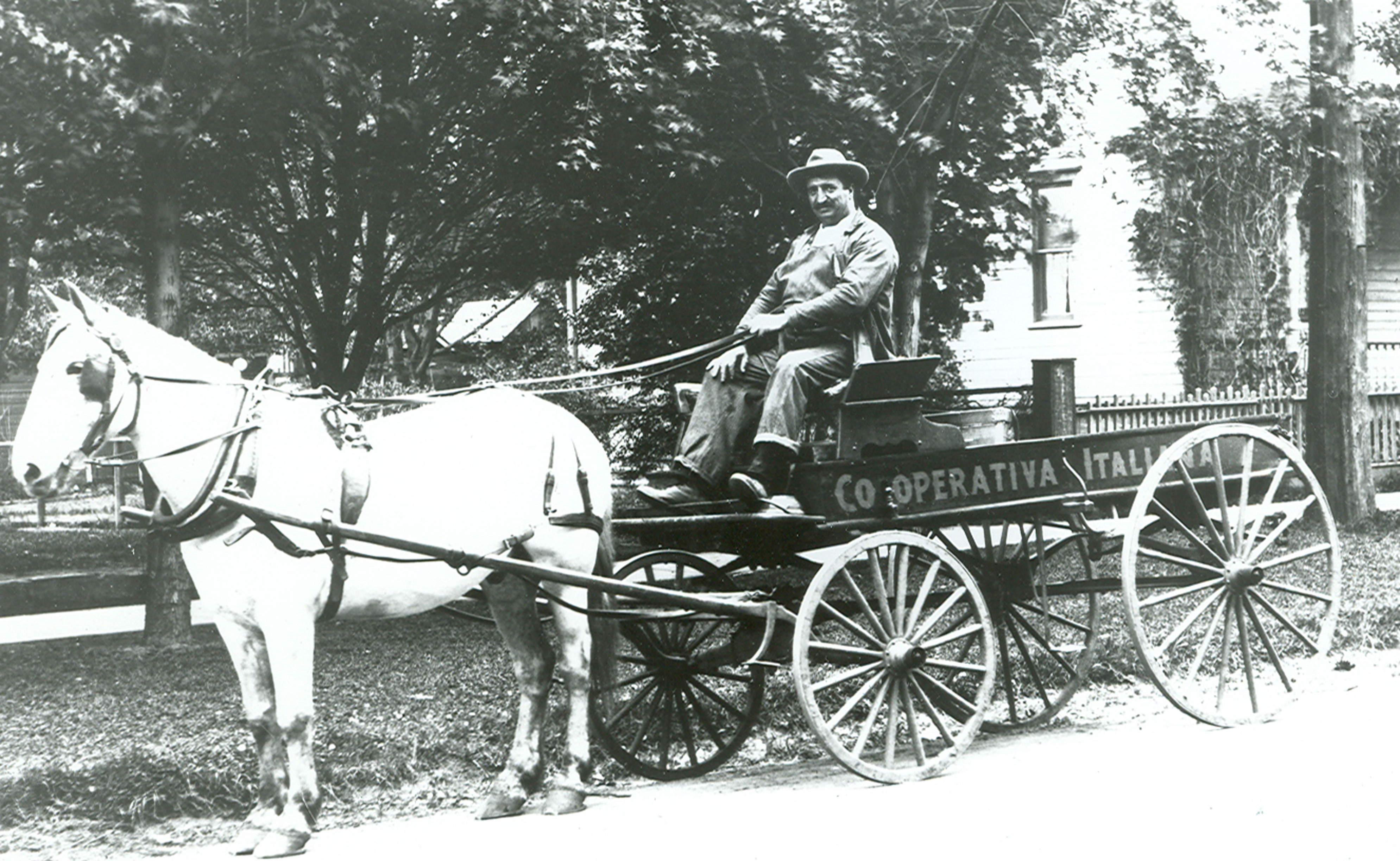 Photograph of the unidentified driver of the Co-operativa Italiana store wagon. The store was an outgrowth of a benevolent society organized May 16, 1900, with 165 charter members, all natives of Capistrano, Abruzzi, Italy. The store was located at 431 Vulcan Street In the Chapin Location, January 1903.