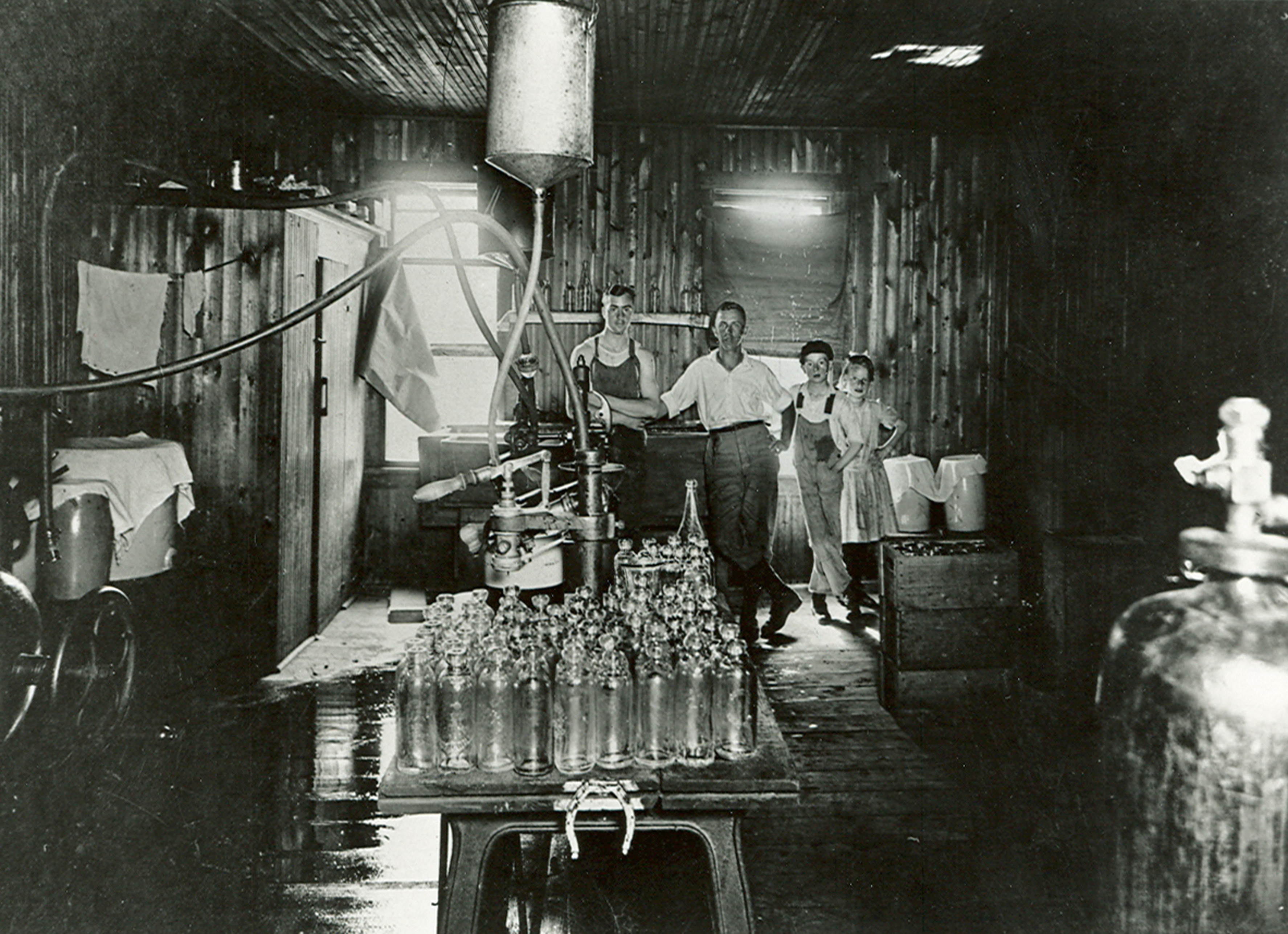 Photograph of the City Bottling Works, located at 224 East 'A' Street. Note the primitive bottling set-up with a galvanized can suspended from the ceiling with a rubber hose for filling the bottles.