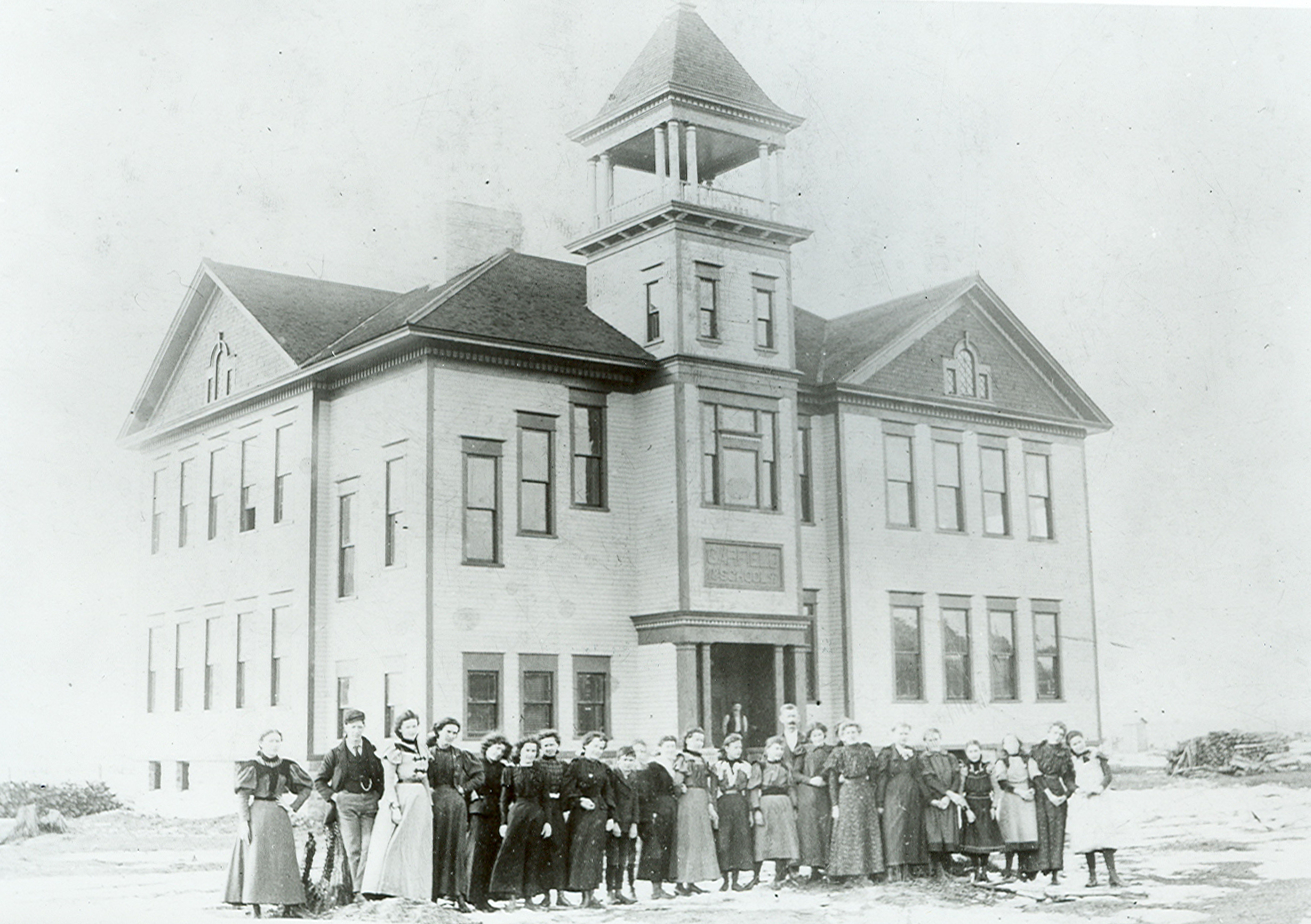 Photograph of Quinnesec's Garfield School, which formally opened December 23, 1897, replacing the Pioneer School which could no longer be used due to its proximity to the Cundy Mine. This two-story building was located where the Breitung Township Hall now stands. When the school opened, classes from kindergarten through eighth grade were taught. Those desiring a high school education had to go to Iron Mountain.