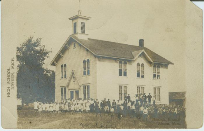 Black and white photograph of students in front of Dryden High School