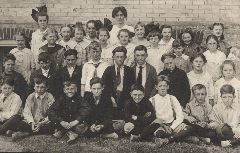 Black and white postcard of school children posed outside Alden School building, Alden, Michigan, ca. 1917