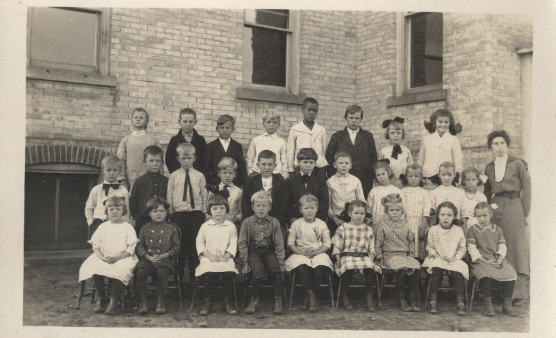 Black and white postcard of Miss DuFresne's Room, Grade 4, posed outside Alden School, Alden, Michigan, 1916-1917. Marian Coy is somewhere in picture.
