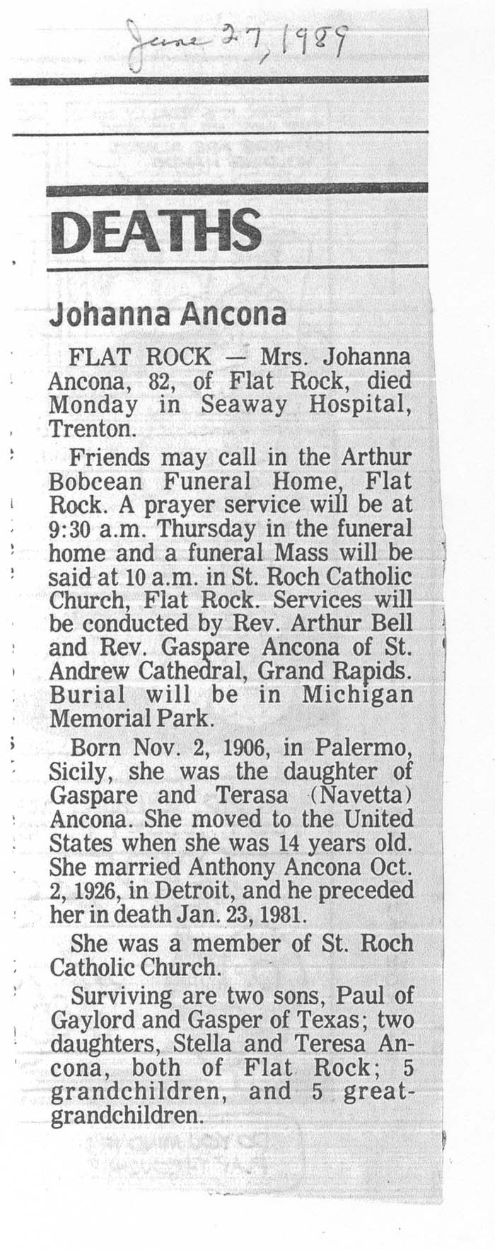 Obituary of Johanna Ancona, born November 2, 1906 in Palermo, Sicily. Resided in Flat Rock, Michigan.