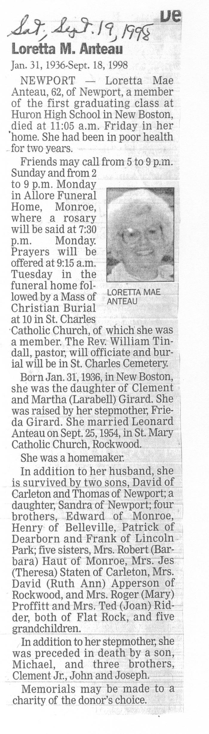 Obituary of Loretta Mae Anteau born Jan.31, 1936 in New Boston, Michigan. Resided in Newport, Michigan.