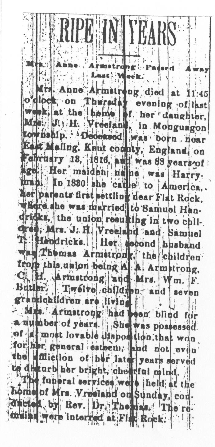 Obituary of Mrs. Anne Armstrong born in Kent County, England February 18, 1816. Settled near Flat Rock, Michigan.