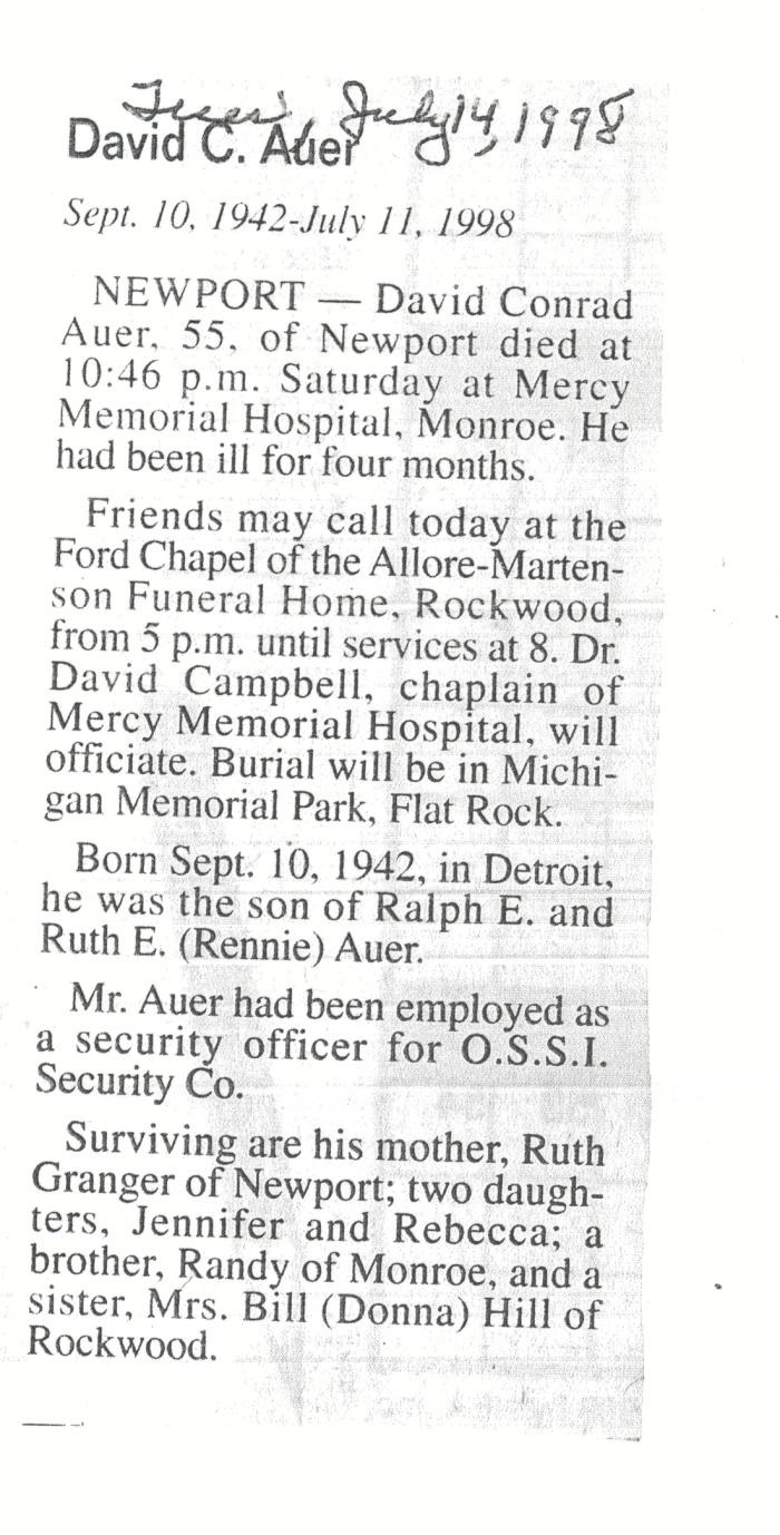 Obituary of David Conrad Auer born in 1942 in Detroit, Michigan. He resided in Newport, Michigan.