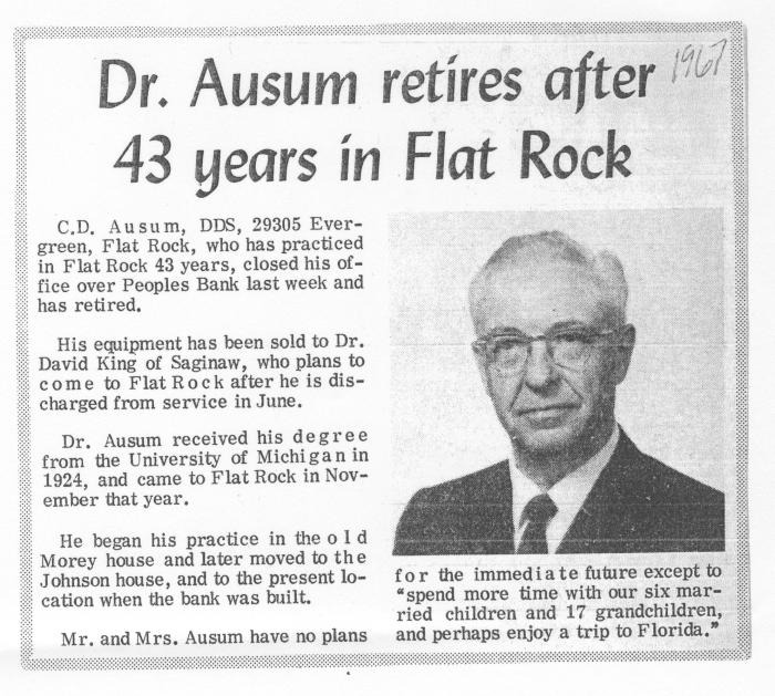 Obituary of C.D. Asum . Resided in Flat Rock, Michigan and had a dental practice in the city.